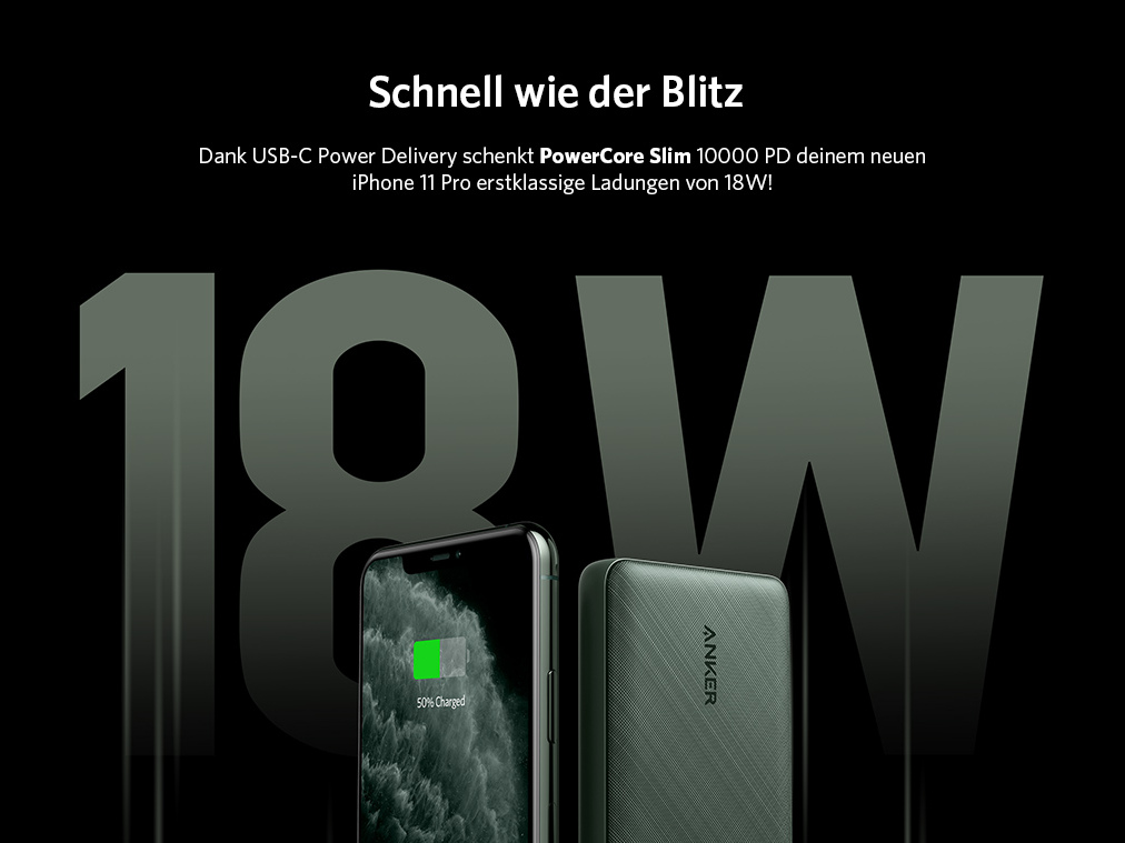 Die schlanke 18-Watt-Powerbank mit einer Bruttokapazität von 10.000 mAh ist 14 Millimeter flach, wiegt 213 Gramm und lädt das iPhone 11 Pro laut Herstellerangaben in 30 Minuten auf eine Kapazität von rund 50 Prozent auf. Das 1,8 Meter lange und zertifizierte High-Speed-Ladekabel ist MFi-kompatibel und soll mehr als 12.000 Biegungen ohne Schäden überstehen.