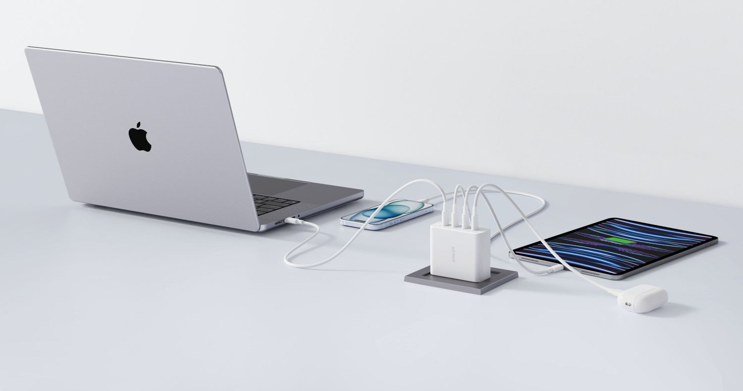 Gleiches ist auch mit dem Top-Modell Anker Ladegerät (240 Watt mit vier Anschlüssen) in Weiß möglich. Allerdings kann dieses laut UVP 149,95 Euro kostende Desktop-Ladegerät insgesamt bis zu 240 W über seine vier Ports bereitstellen und zudem dank Kabel fernab einer Steckdose aufgestellt werden.