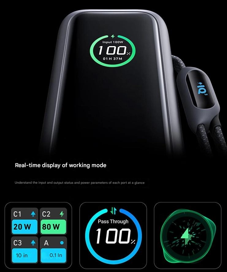 Die maximale Gesamtleistung beträgt 165 W, bei Nutzung aller vier Anschlüsse verteilt sich die Leistung auf 120 W, 20 W und 10 W an den USB-C-Ausgängen und 10 W an USB-A. Über USB-C können zwei Geräte mit 100 W und 65 W geladen werden. Der 25.000-mAh-Akku soll ein iPhone 16 Pro viermal oder ein MacBook Air 1,3-mal vollständig aufladen können und wird mit 100 W in zwei Stunden wieder einsatzbereit sein. Ein weiteres Feature ist das integrierte Display mit einer Helligkeit von bis zu 720 Nits, das Informationen wie Ladestand, Leistung, Temperatur und Batteriezustand anzeigt.
