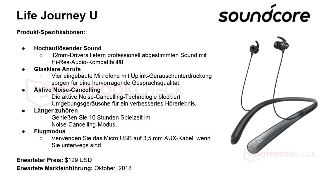 - Soundcore Life Journey U: optimiertes Nackenbügel-Bluetooth-Headset mit 12-mm-Treibern, vier Mikrofonen, Noise-Cancelling-Funktion (NC) sowie bis zu 10 Stunden Akkulaufzeit im NC-Modus. Preis: etwa knapp 130 US-Dollar.