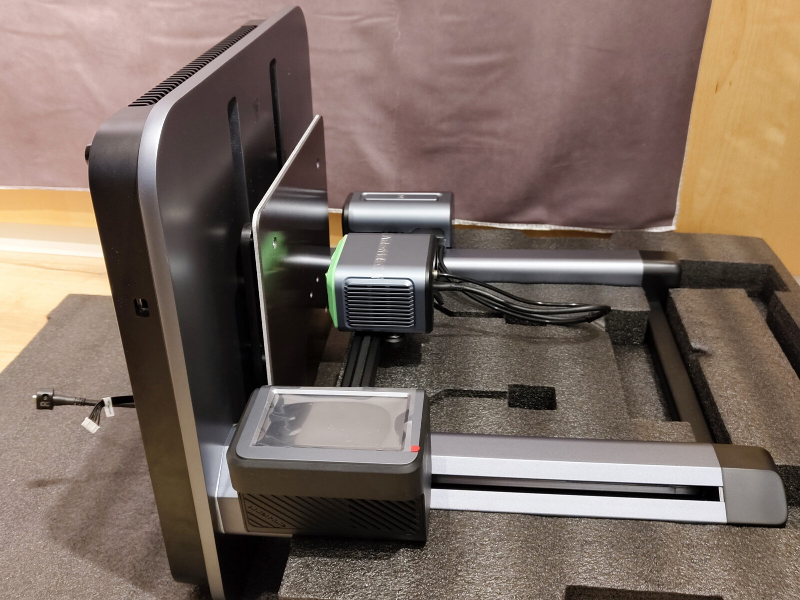 Mit dem beigelegtem Werkzeug lässt sich der Aufbau des 3D-Druckers gut bewältigen. Die Schaumstoffteile der Verpackung sollte man dabei unbedingt bereithalten. Anker hat sich hier ein cleveres Verfahren ausgedacht, um die schweren Teile des Druckers leicht zu handhaben. Dazu kann man den Torbogen, wie im Bild unten, einfach in den Schaumstoff einlegen. So lassen sich die wenigen Schrauben leicht eindrehen. Anschließend werden nur vier Kabel eingesteckt, davon werden zwei mit Schrauben gesichert, und der Filamenthalter an der ausgewählten Position verschraubt.
