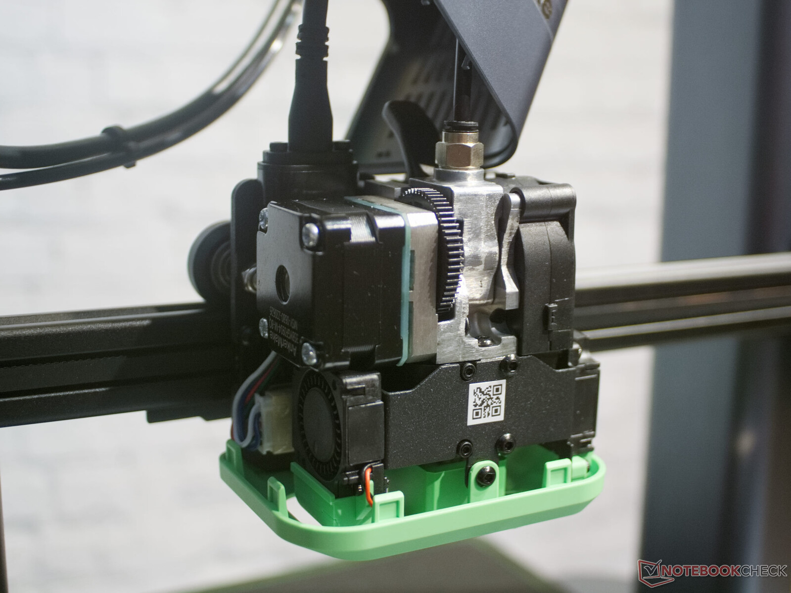 Das Hotend vom AnkerMake M5 benutzt kaum Standardteile. Die Länge des Gewindes an der Düse liegt mit einem Zentimeter zwischen einer MK8- und einer Volcano-Düse. Auch der Heizblock hat keine typischen Abmaße. Zumindest Heizpatrone und Thermistor sind dem Standard bei 3D-Druckern entsprechend. Mit 60 W Heizleistung ist die Heizpatrone ausreichend dimensioniert für die hohen Druckgeschwindigkeiten, welche der AnkerMake M5 erreichen soll. Der Kühlungslüfter drückt die Luft zur Rückseite des Druckkopfes hinaus. Somit entsteht beim Drucken von ASA oder ABS kein vom Drucker verursachter Luftzug über der Druckplatte.