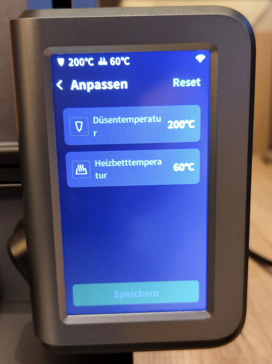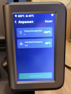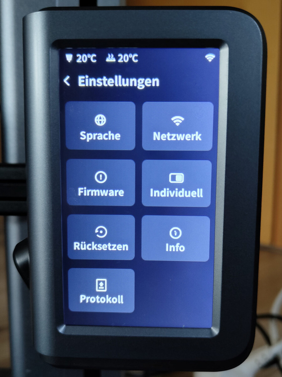 Hinter dem Touchscreen des 3D-Druckers steckt auch ein kleiner Computer. Dieser überwacht und steuert den 3D-Drucker. Die Touchscreen-Oberfläche bietet grundlegende Steuerungsoptionen und ist in mehreren Sprachen verfügbar. Die Menüs sind verständlich strukturiert und übersetzt. Es lassen sich so Einstellungen der Status-LED und der Hinweistöne setzen. Das Mesh-Bed-Leveling kann aufgerufen und das Vorheizen gestartet werden. Auch eine grundlegende Bewegungssteuerung bietet der Touchscreen. Während eines Druckes wird die Druckgeschwindigkeit angezeigt. Die einzigen Parameter, welche sich während eines Druckes ändern lassen, sind die Temperaturen von Druckbett und Hotend. Optionen zu Geschwindigkeit, Extrusionsmultiplikator und zum Lüfter sucht man hier vergebens.