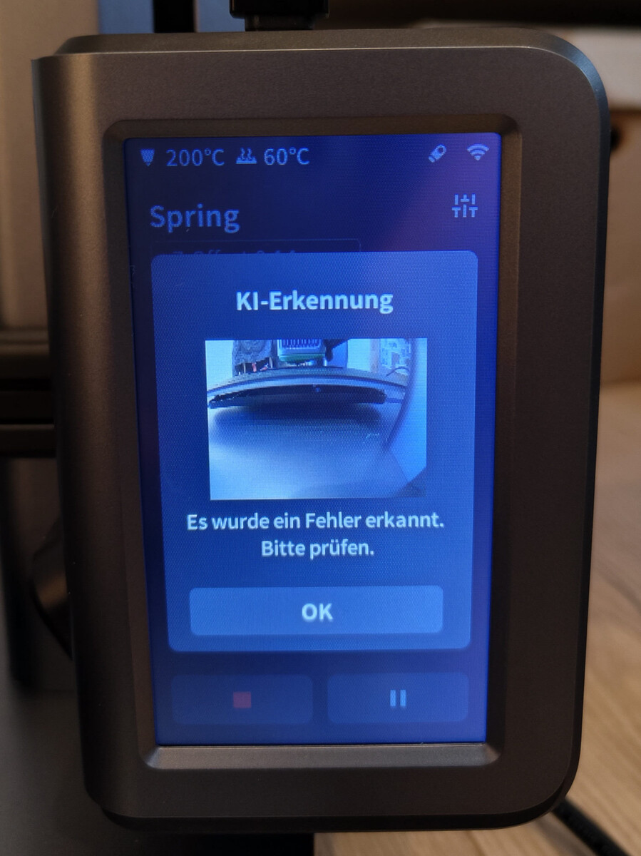 Schwarzes Filament ist so noch ein Problem für die KI im AnkerMake M5, auch sollte man den Aufstellort des 3D-Druckers mit Bedacht wählen. Sobald der Hintergrund, den die Kamera sieht, möglichst gleichförmig ist, verbessert sich die Erkennung. Farbiges oder weißes Filament vereinfacht der KI die Arbeit. Noch ist die KI anscheinend ein nettes Gimmick. Aber ein Problem beim Testen der KI ist auch die geringe Fehlermenge des AnkerMake M5. Alle Fehler, welche die KI erkannt, oder nicht erkannt hat, wurden von uns absichtlich hervorgerufen. Im normalen Betrieb kam es zu keinem einzigen Fehler beim Drucken und die KI meldete nur einmal einen Fehlalarm.
