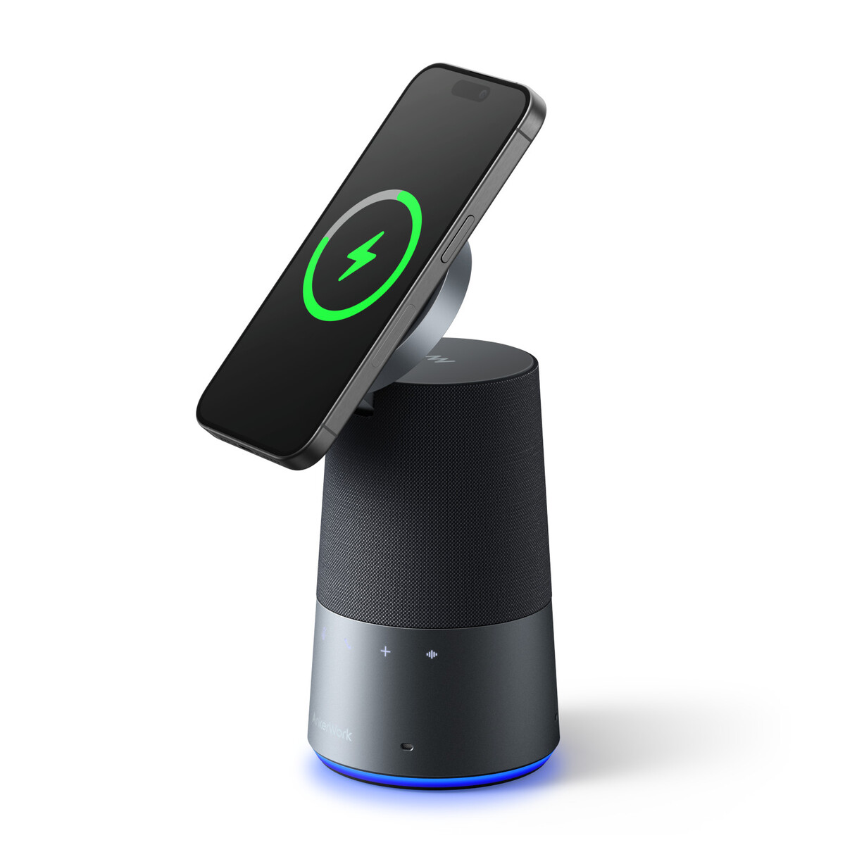 Zudem bietet das neue Speakerphone von AnkerWork noch einen Zusatznutzen. Auf der Oberseite ist eine Qi-2.0-Ladefläche untergebracht. Diese unterstützt die magnetische Schnellladetechnologie bis 15 W und ermöglicht so das kabellose Laden von externen Geräten wie Smartphones, sodass diesen auch bei langen Konferenzen nicht die Energie ausgeht. Zusätzlich kann das Gerät dank der neigbaren Ladefläche im Blick behalten werden.