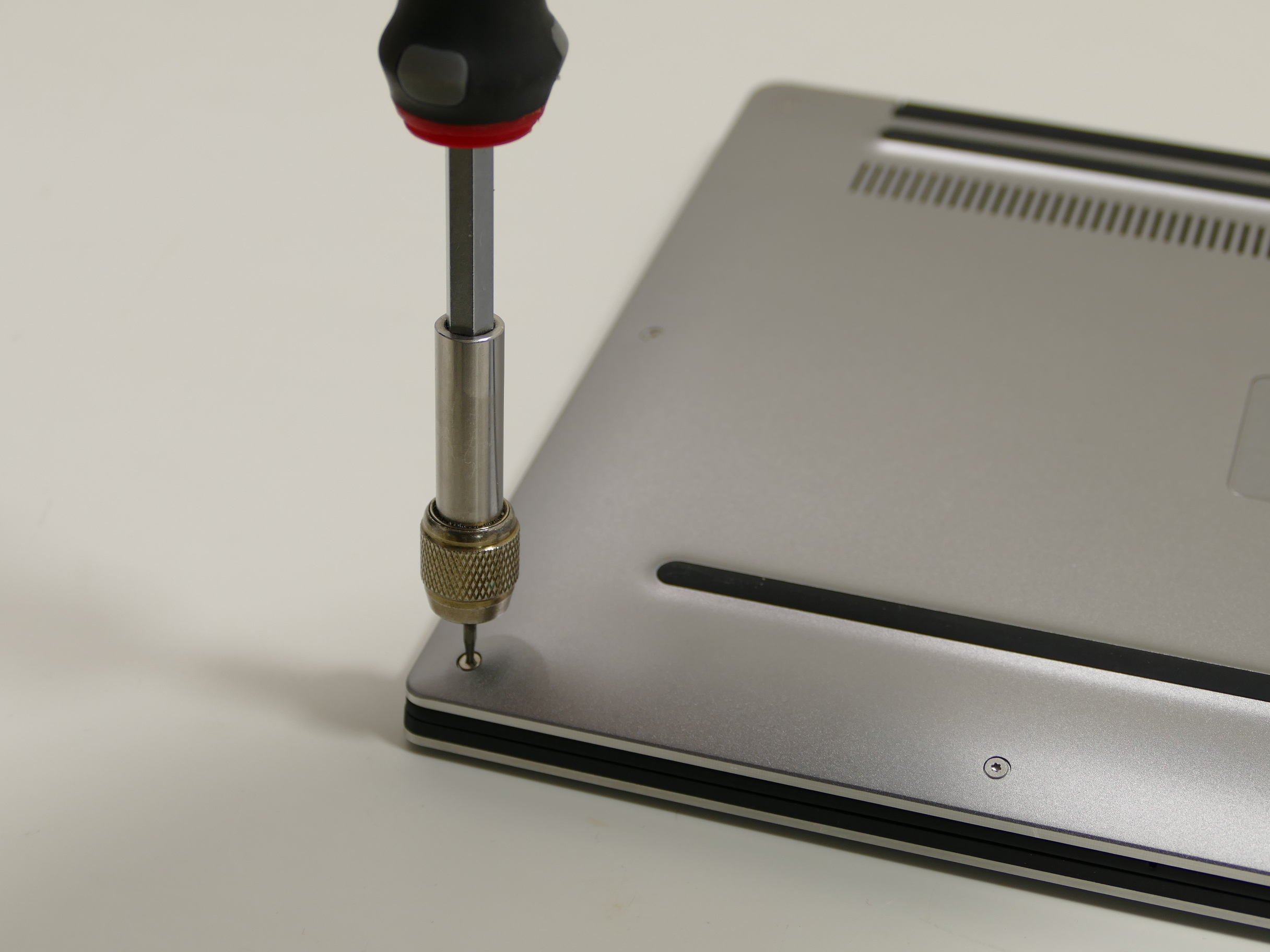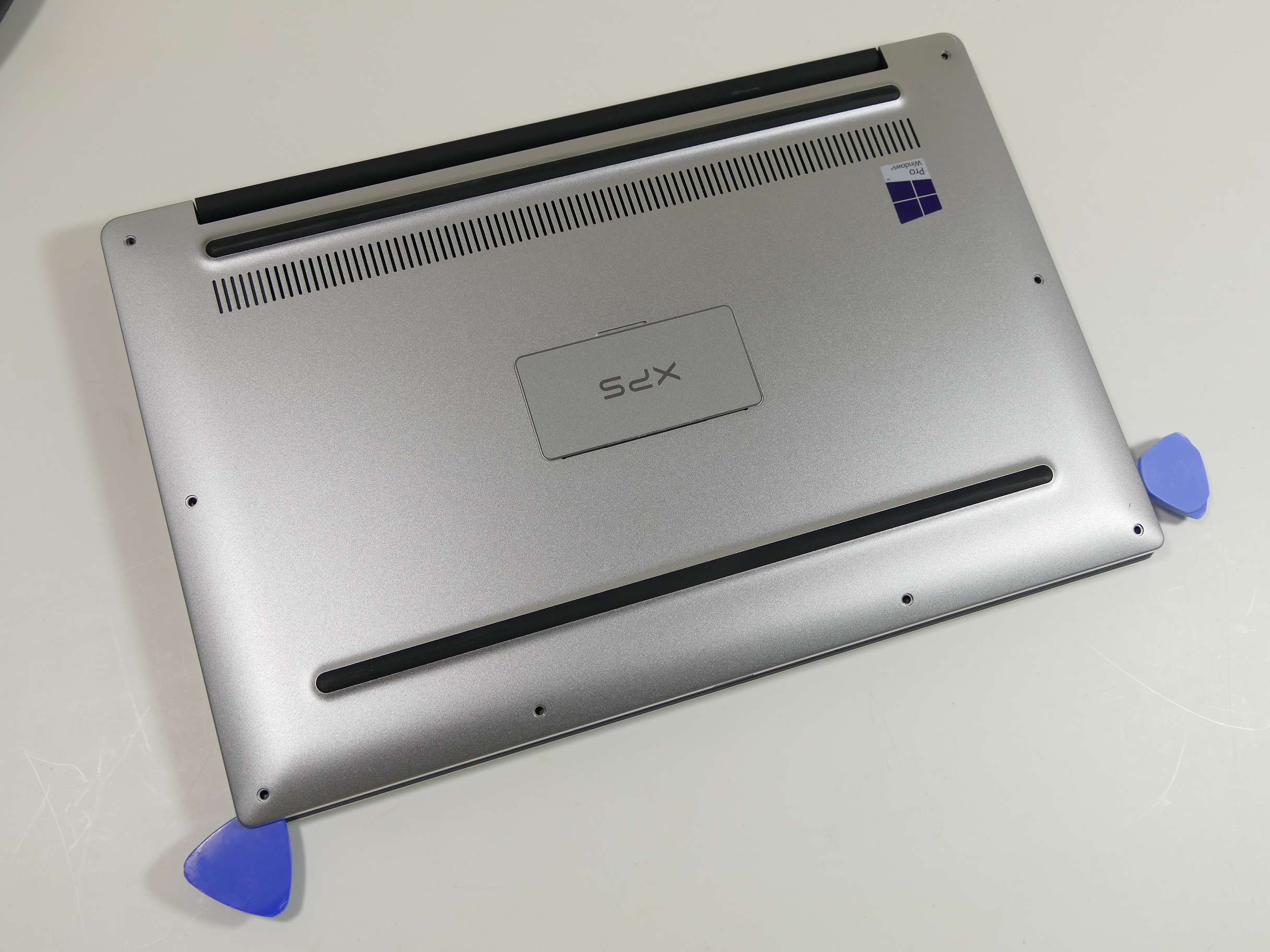 Nun ist die Zeit gekommen, um Hand an die Hardware zu legen. An der Unterseite des XPS 13 sind gut jene 8 Torx-T5-Schrauben zu sehen, die zuerst gelöst werden müssen. Die letzte neunte Schraube (Kreuzschlitz) befindet sich unter der XPS-Klappe und unterscheidet sich zudem in ihrer Länge von den übrigen Schrauben. Im nächsten Schritt empfiehlt sich der Einsatz von zwei schmalen Kunststoff-Hebeplättchen, mit denen die Alu-Unterschale vorsichtig von der Baseunit abgehoben wird. Am besten, man beginnt hier im hinteren Eckbereich und arbeitet sich dann langsam Stück für Stück rund um das Gehäuse vor. Hier ist große Vorsicht geboten, da die Alu-Schale von Kunststoffhaken im Inneren gehalten wird, die es nicht abzubrechen gilt. Hat man die Platte rundum gelöst, diese an einer Seite abheben und vorsichtig vom Gerät nehmen. Nun hat man Zugriff auf die Komponenten im Inneren.