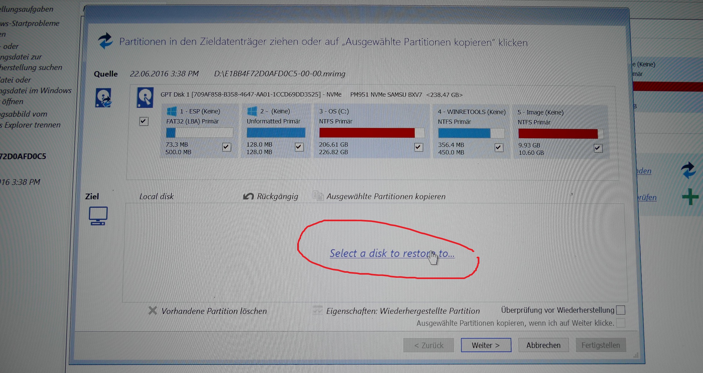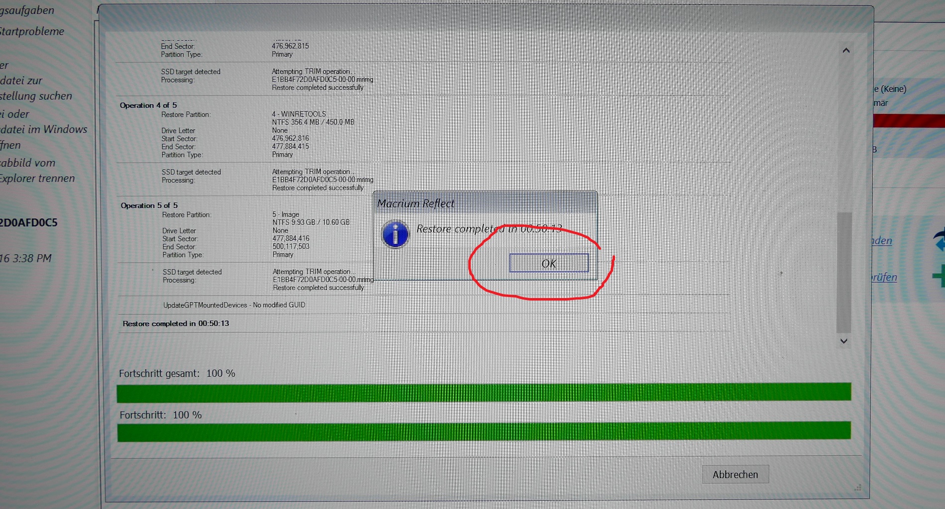 Nach dem Einbau der neuen SSD den Rettungs-USB-Stick anstecken und das System starten. Es wird direkt die Wiederherstellungs-Software von Macrium gestartet. Sicherungslaufwerk und Datei auswählen, Sicherung einspielen. Auch diese Schritt kann je nach Datenvolumen bis zu rund einer Stunde dauern. Nachdem der Wiederherstellungsprozess beendet ist, Rettungs-Stick und Sicherungs-HDD entfernen und System neu starten. Windows wird gestartet, das System entspricht exakt dem Zustand wie zum Zeitpunkt der Sicherung.
