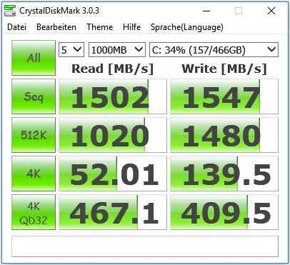 Unsere Speicher-Benchmarks bringen sogleich Ernüchterung. "Nur" rund 1.400 MB/s im AS SSD Test (Seq.) beim Lesen und rund 1.350 MB/s beim Schreiben. Diese Werte toppen zwar den ursprünglich eingesetzten SSD-Speicher deutlich (1.300/240 MB/s), bleiben aber gleichzeitig deutlich hinter den theoretischen Maximalwerten zurück. Im Thinkpad T460s konnten wir bereits einen Speicher der SM951-Familie testen und dort auch hohe 2.000/1.400 MB/s im Benchmark beobachten. Wo ist hier der Flaschenhals?