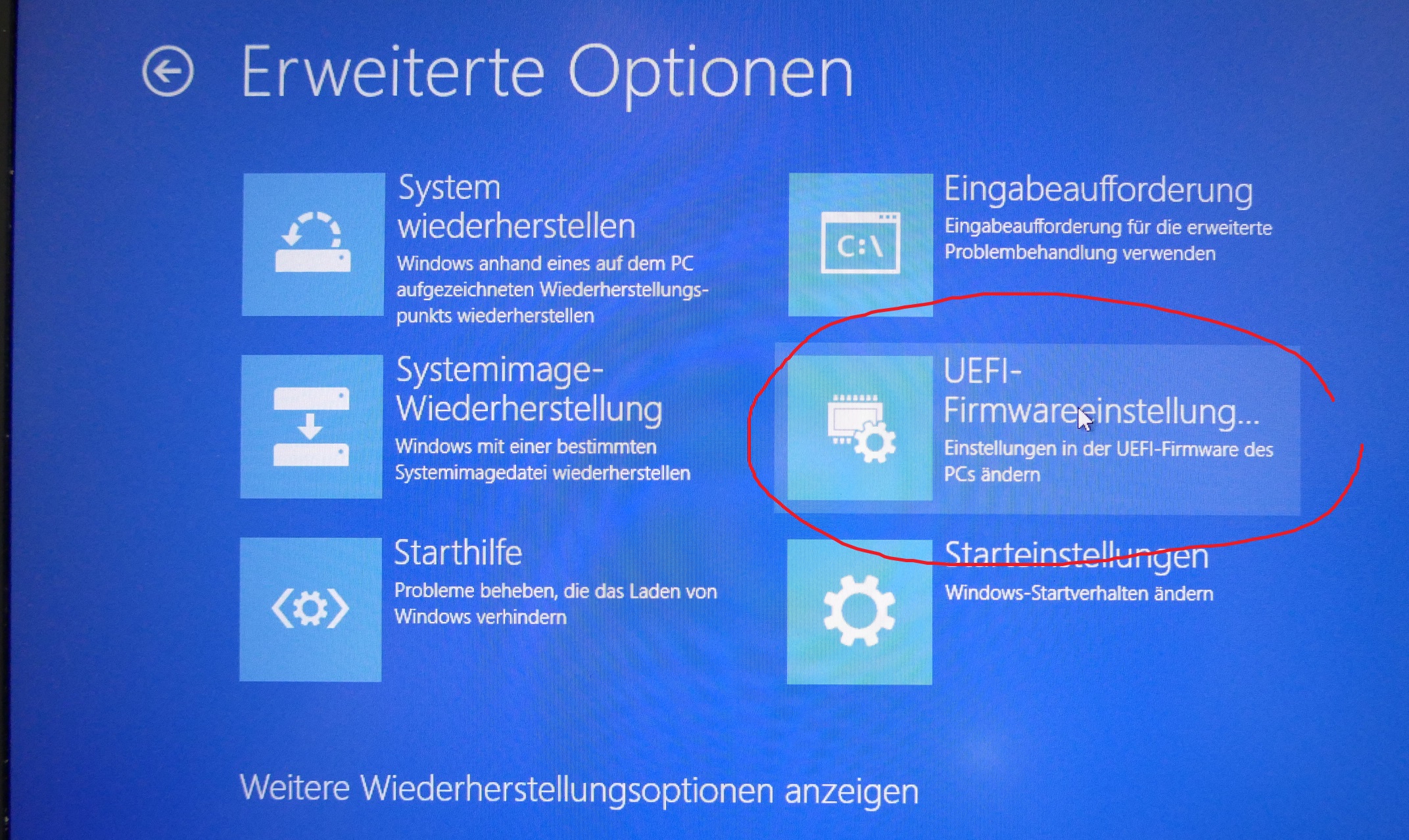 Um nach einem Sart von dem erstellten Rettungsmedium (USB-Stick) booten zu können, muss im BIOS die entsprechende Einstellung vorgenommen werden. Die kann mit wenigen Klicks auch bequem aus Windows heraus passieren.