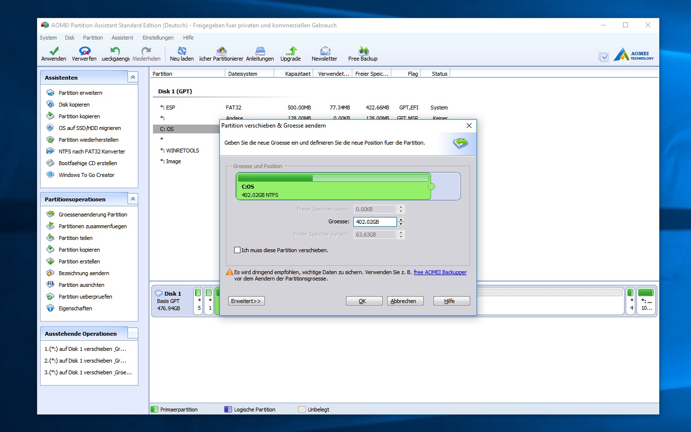 Um die Systempartition erweitern zu können, muss der neue, unbelegte und nicht zugeordnete Speicherplatz direkt neben der Systempartition zur Verfügung stehen. Um dies zu erreichen werden etwaige dazwischen liegende Partitionen nacheinander hinter den unbelegten Speicherplatz geschoben. Per Rechtsklick auf die jeweilige Partition, Auswahl "Größenänderung Partition" wird ein Fenster geöffnet, auf dem sich nun größe als auch Position der Partition verändern lassen. Bei den dazwischen liegenden Partitionen wird lediglich die Position nach rechts verschoben, die Große bleibt gleich. Befindet sch letztlich der neue Speicherplatz neben der Systempartition, kann diese durch selbiges Prinzip nun in ihrer Größe geändert werden und um den freien Speicherplatz erweitert werden. Mit Beenden der Software die Änderungen übernehmen, fertig.