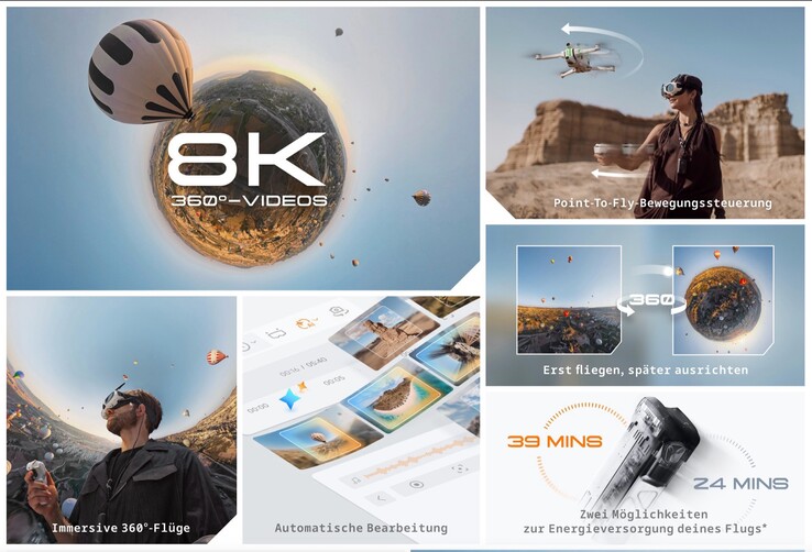 Durch das 360-Grad-Sichtfeld ist es möglich, in eine Richtung zu schauen, während in eine andere Richtung geflogen wird. Das mitgelieferte, 340 Gramm schwere Headset erreicht eine Auflösung von 2.560 x 2.560 Pixel pro Auge, ein Sichtfeld von 90 Grad und eine Dioptrie-Korrektor von –2 bis +5 Dioptrien. Die sogenannte "Point fo Fly"-Bewegungssteuerung soll es besonders einfach machen, die Drohne zu steuern. Nähere Details zur Antigravity A1 gibts auf der offiziellen Produktseite.