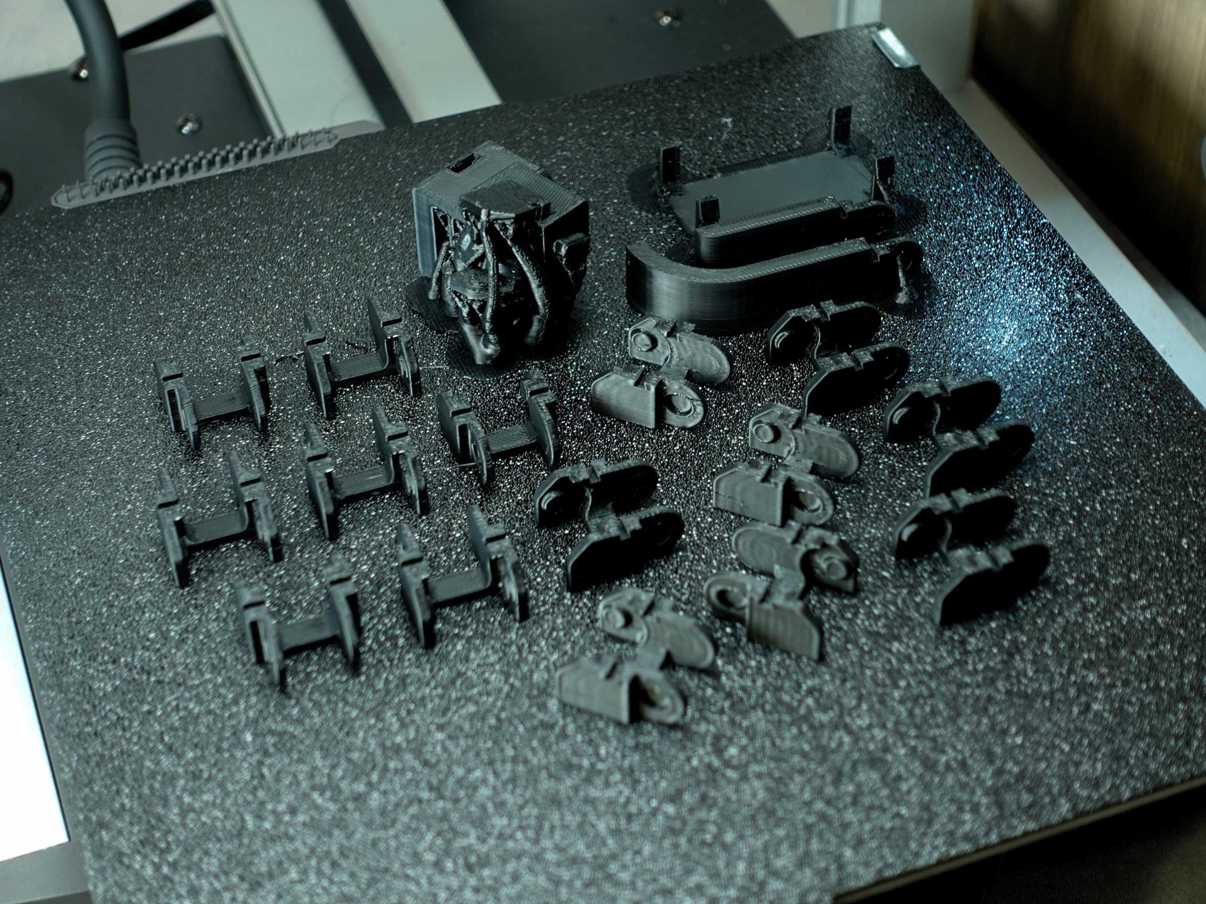 Als Druckoberfläche kommt eine flexible, doppelseitig beschichtete Federstahlplatte zum Einsatz. Die Platte ist mit einer texturierten PEI-Schicht versehen. Diese raue Oberfläche sorgt in der Regel für eine exzellente Haftung der ersten Schicht und hinterlässt ein mattes, hochwertig wirkendes Finish. Nach Abschluss des Drucks kühlt das Bauteil ab und lässt sich durch leichtes Biegen der Platte einfach entfernen.