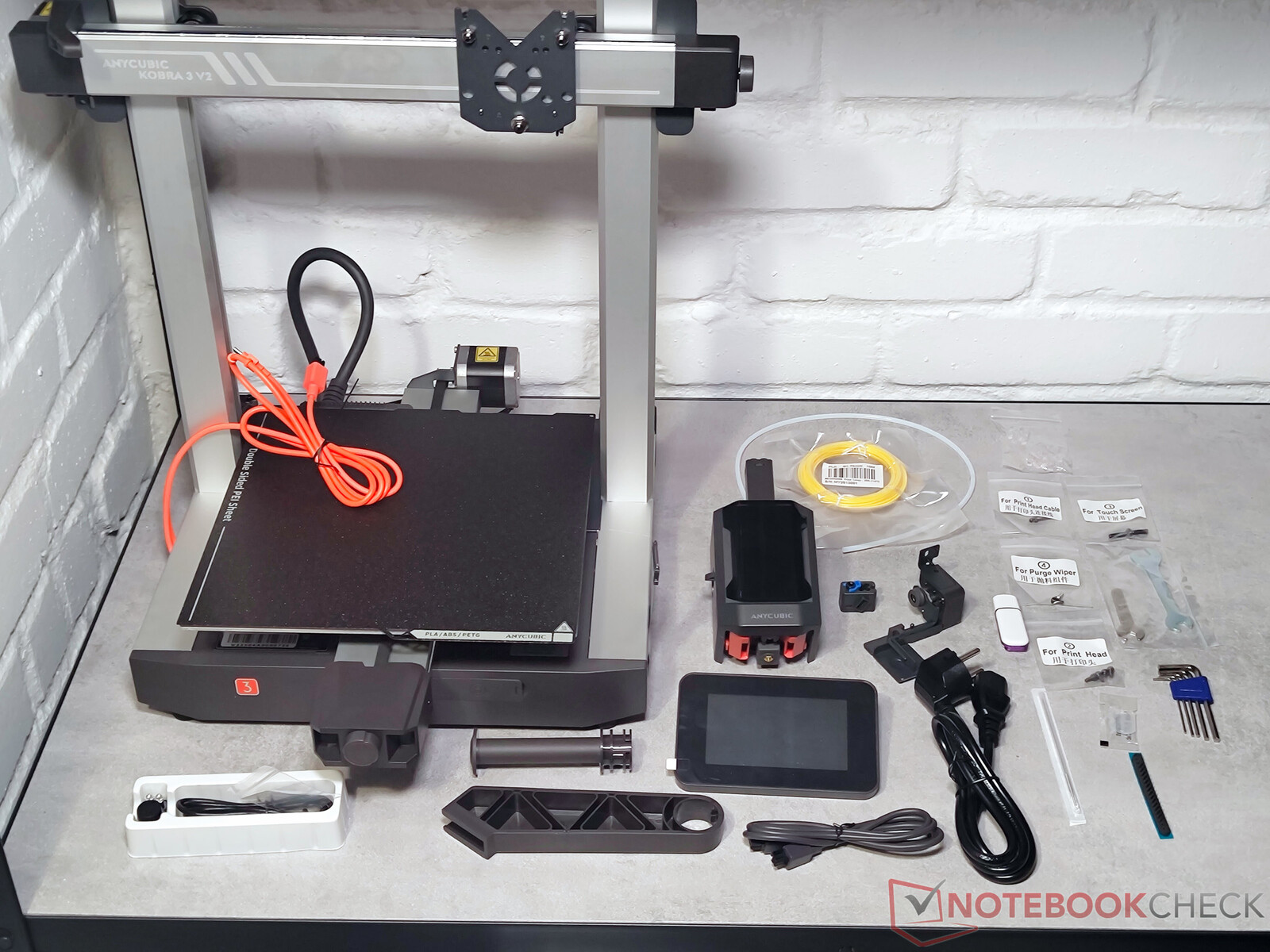 Der Anycubic Kobra 3 V2 wird größtenteils vormontiert geliefert. Die Endmontage, welche das Anschrauben des Druckkopfes, des Bildschirms und das Verbinden der Kabel umfasst, ist in weniger als 30 Minuten abgeschlossen. Direkt nach dem ersten Einschalten startet der Drucker einen vollautomatischen Selbsttest. Dieser kalibriert nicht nur das Druckbett präzise über das LeviQ 3.0 System, sondern richtet auch die Vibrationskompensation ein, was die Grundlage für eine hohe Druckqualität bei hohen Geschwindigkeiten legen soll.
