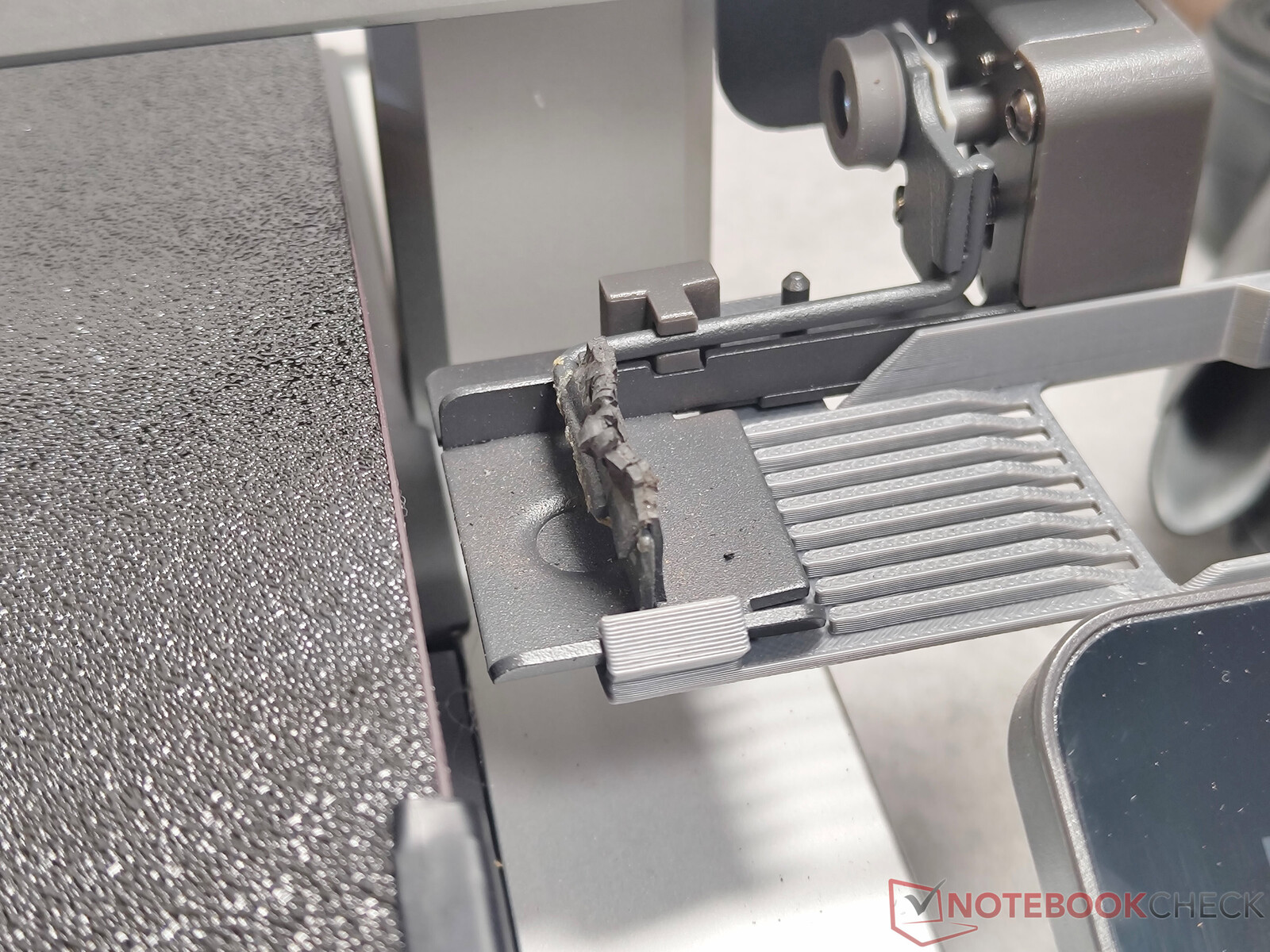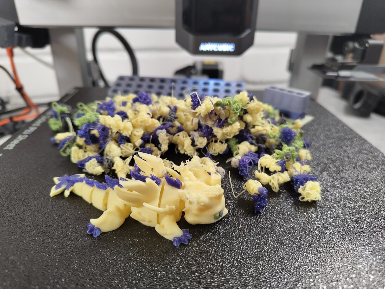 Die größte Enttäuschung war im Test jedoch die Kernfunktion: der Mehrfarbendruck. Dieser funktionierte ab Werk nicht zuverlässig, da der Purge-Vorgang, also die Reinigung der Düse beim Farbwechsel, fehlerhaft ist. Der Druckkopf zog immer wieder Filamentreste mit auf das Druckobjekt und ruinierte den Druck. Ursache ist ein simpler Designfehler: Der mechanische Reinigungsschieber ist zu weit von der Düse entfernt. Erst mit einem selbst angebrachten Gummistreifen ließ sich das Problem beheben. Eine solche Nachbesserung durch den Anwender darf bei einem neuen Gerät nicht erforderlich sein und entwertet das Hauptverkaufsargument des Systems erheblich. Hinzu kommt der hohe Filament-Abfall, der bei jedem Farbwechsel entsteht und die Materialkosten in die Höhe treibt. Wie das Foto unseres fehlgeschlagenen Drucks zeigt, übersteigt das Gewicht des Abfalls schnell das des eigentlichen Objekts. Zugegeben: Der relative Abfall sinkt, wenn man die Druckplatte mit vielen bunten Modellen füllt und vielleicht noch ein paar funktionale Teile als Flush-Objekte druckt. Die Bilanz des bunten Drucks ist trotzdem fragwürdig.