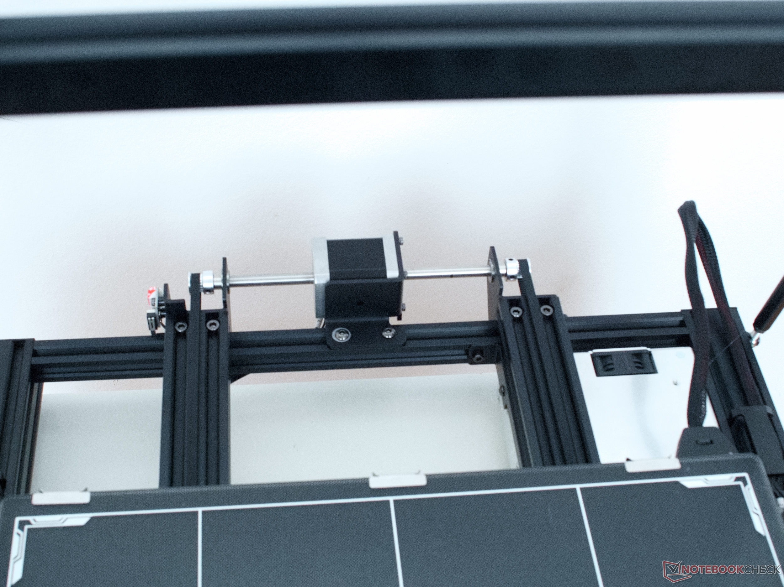Zwei Pendelstützen geben dem Anycubic Kobra Max dringend benötigte Stabilität. Wie bei vielen aktuellen 3D-Druckern üblich, laufen hier alle bewegten Teile auf einer Kombination von V-Slot-Profilen und D-Rollen. Die eigentlich sehr steife Kombination kommt aber hier gerade aufgrund der Längen einzelner Profile an ihre Grenzen. Während in der Basis mit großen 40 mm × 40 mm Profilen nicht gespart wird, ist gerade das 20 mm Laufprofil des Druckkopfes doch recht flexibel.