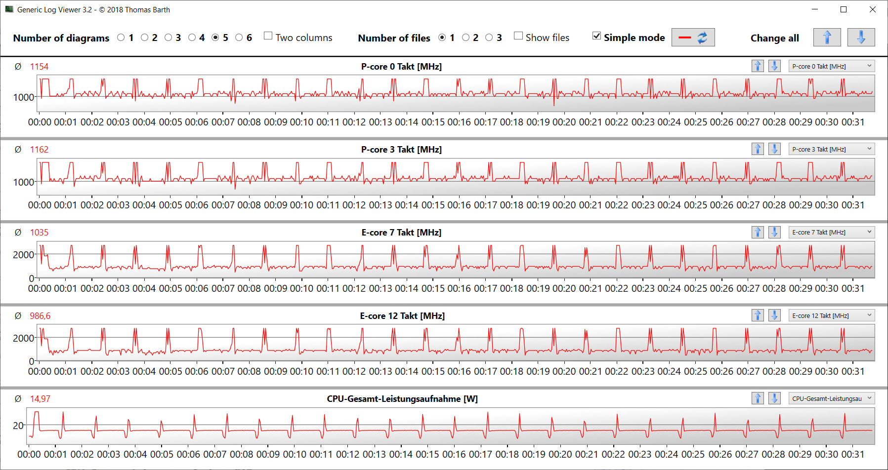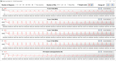 Der Stresstest (Prime95 und Furmark im Dauerbetrieb) stellt ein Extremszenario zur Überprüfung der Systemstabilität unter Volllast dar. Die CPU bearbeitet den Test (Prime95 und Furmark laufen für mindestens eine Stunde) mit Taktraten (P-Kerne: ca. 2,5 GHz; E-Kerne: ca. 2,3 GHz) aus dem mittleren Bereich. Die GPU geht mit Geschwindigkeiten zwischen 1.000 und 1.500 MHz zu Werke.