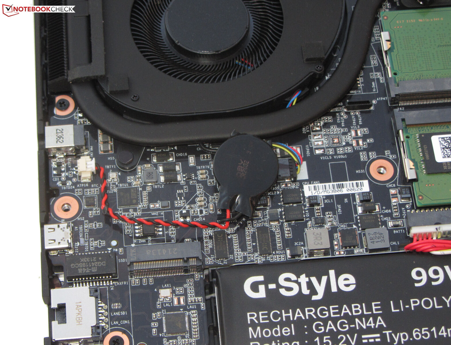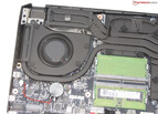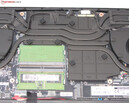 Nach Entfernung aller Schrauben auf der Geräteunterseite, kann die Unterschale mit Hilfe eines flachen Spatels oder eines Fugenglätters abgelöst werden. Anschließend besteht Zugriff auf die Arbeitsspeicherbänke (beide belegt), die SSD (PCIe 4), den zweiten M.2-2280-Steckplatz (PCIe 4), die BIOS-Batterie, das WLAN-Modul, die Lüfter, die Lautsprecher und den Akku.