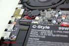 Das anschließende Aufhebeln gelingt auch ohne Werkzeuge von den Ecken der Handballenauflagen her sehr gut. Sodann erhält man Zugang zu den Lüftern, dem RAM, den zwei SSD-Schächten, dem WLAN-Modul, dem Akku und weiteren Komponenten. Das Aorus 15G ist damit angenehm wartungsfreundlich.