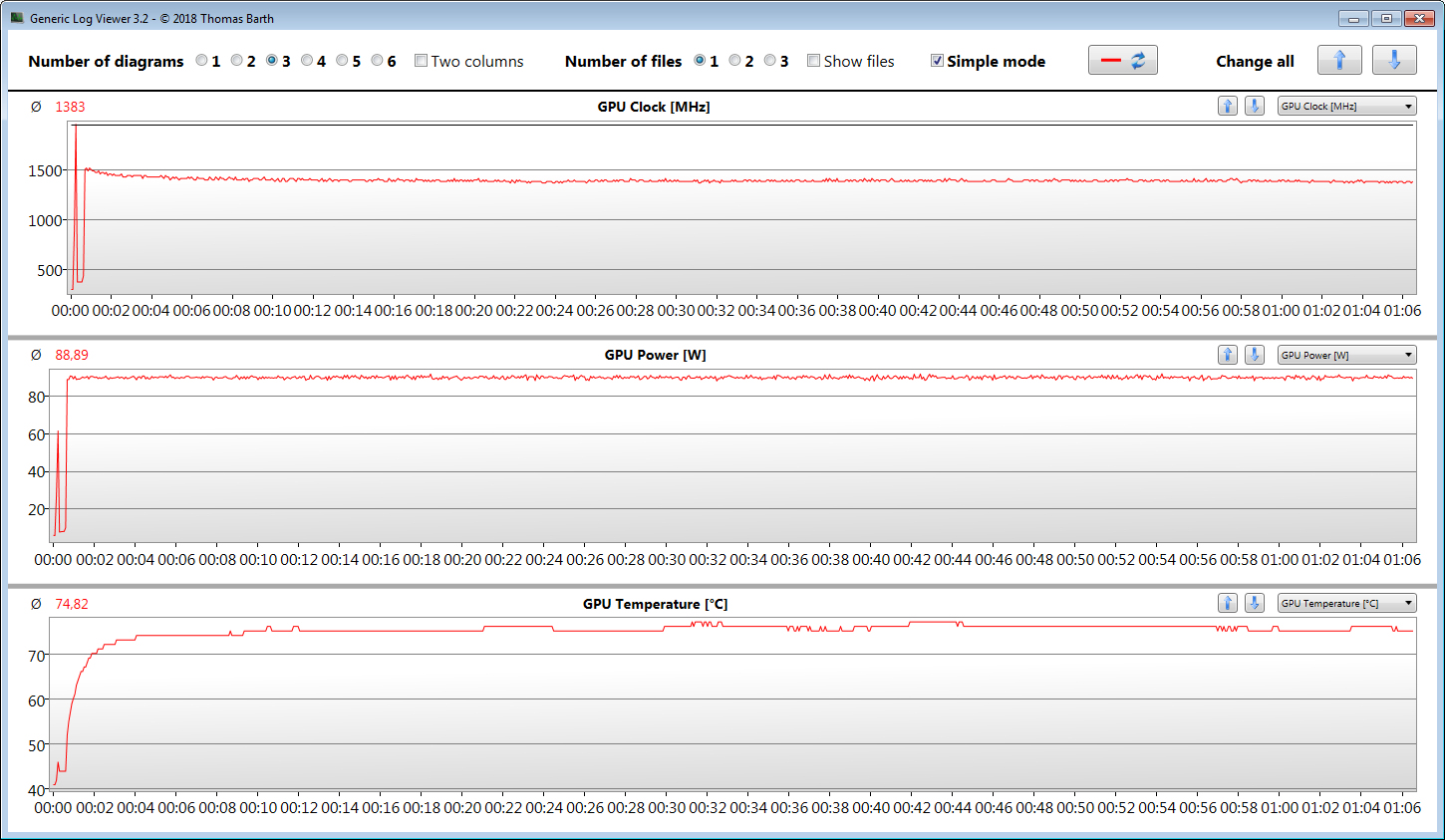 Unseren Stresstest (Prime95 und Furmark laufen für mindestens eine Stunde) bearbeiten CPU bzw. GPU mit 2,8 bis 2,9 GHz bzw. 1.230 MHz. Der Stresstest stellt ein Extremszenario dar, welches so im Alltag nicht auftritt. Wir überprüfen mit diesem Test, ob das System auch bei voller Auslastung stabil läuft.