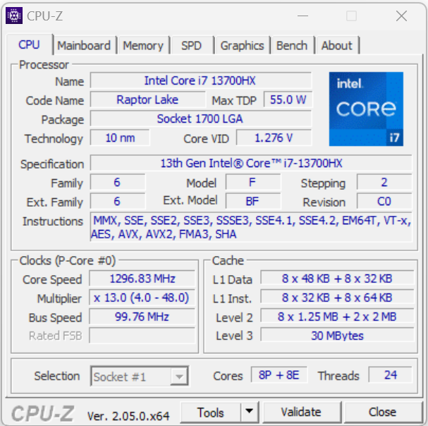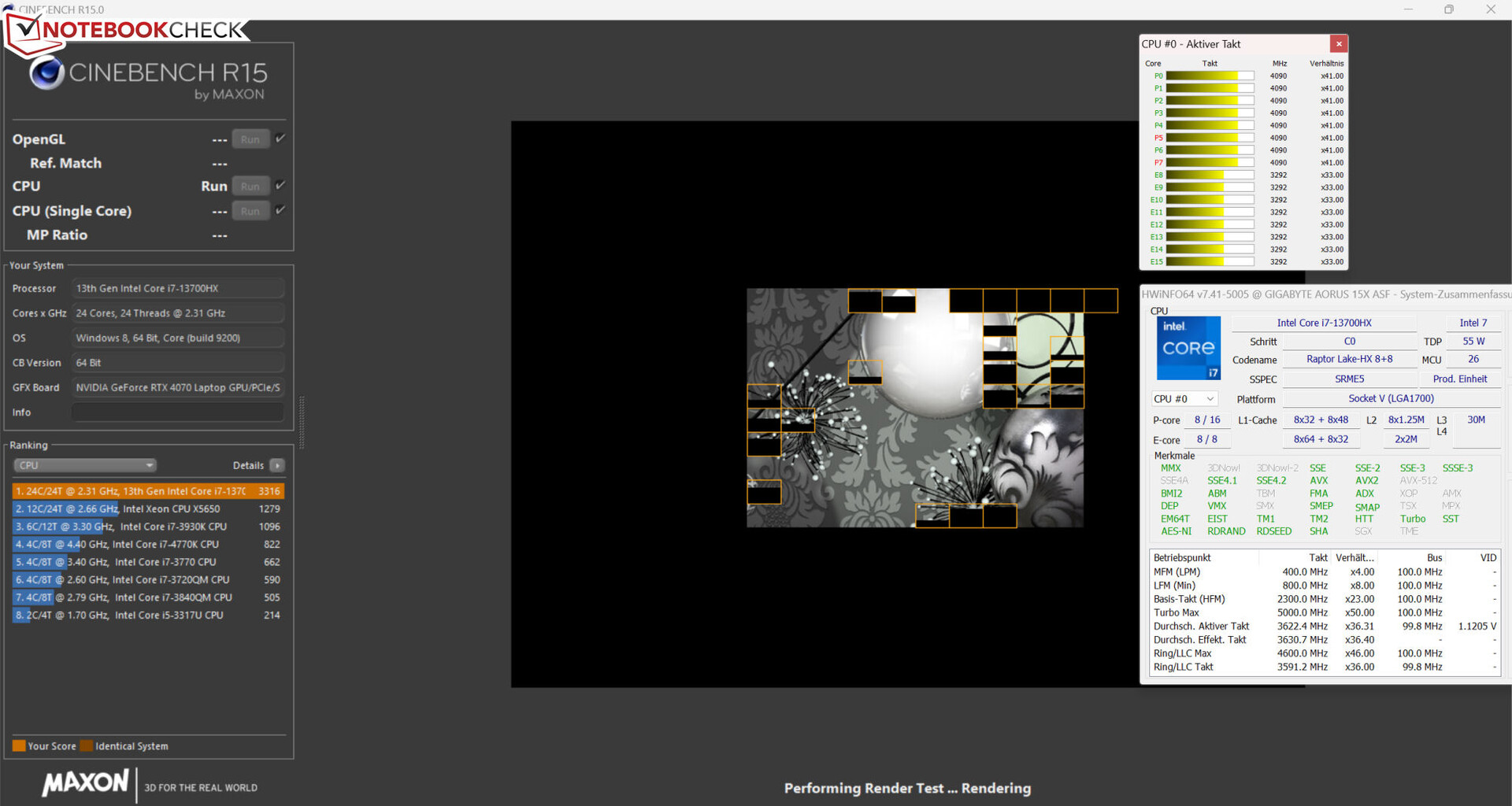Der Core-i7-13700HX-Prozessor (Raptor Lake) setzt sich aus acht Effizienzkernen (kein Hyperthreading, 1,5 bis 3,7 GHz) und acht Performancekernen (Hyperthreading, 2,1 bis 5 GHz) zusammen. In der Summe ergeben sich 24 logische CPU-Kerne. Die Benchmarks liefern Resultate auf dem Niveau des ermittelten Durchschnitts der CPU.