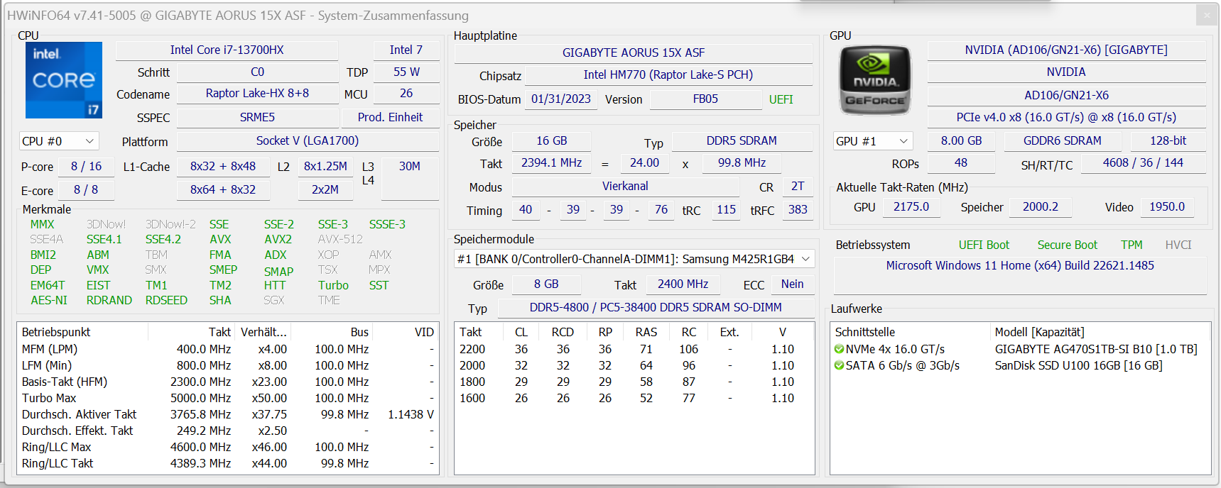 | Aorus 15X ASF i7-13700HX, GeForce RTX 4070 Laptop GPU, 99 Wh | Razer Blade 15 OLED (Early 2022) i9-12900H, GeForce RTX 3070 Ti Laptop GPU, 80 Wh | MSI Katana 17 B13VFK i7-13620H, GeForce RTX 4060 Laptop GPU, 53.5 Wh | Asus ROG Strix G17 G713PI R9 7945HX, GeForce RTX 4070 Laptop GPU, 90 Wh | Acer Predator Helios 300 (i7-12700H, RTX 3070 Ti) i7-12700H, GeForce RTX 3070 Ti Laptop GPU, 90 Wh | Durchschnitt der Klasse Gaming | |