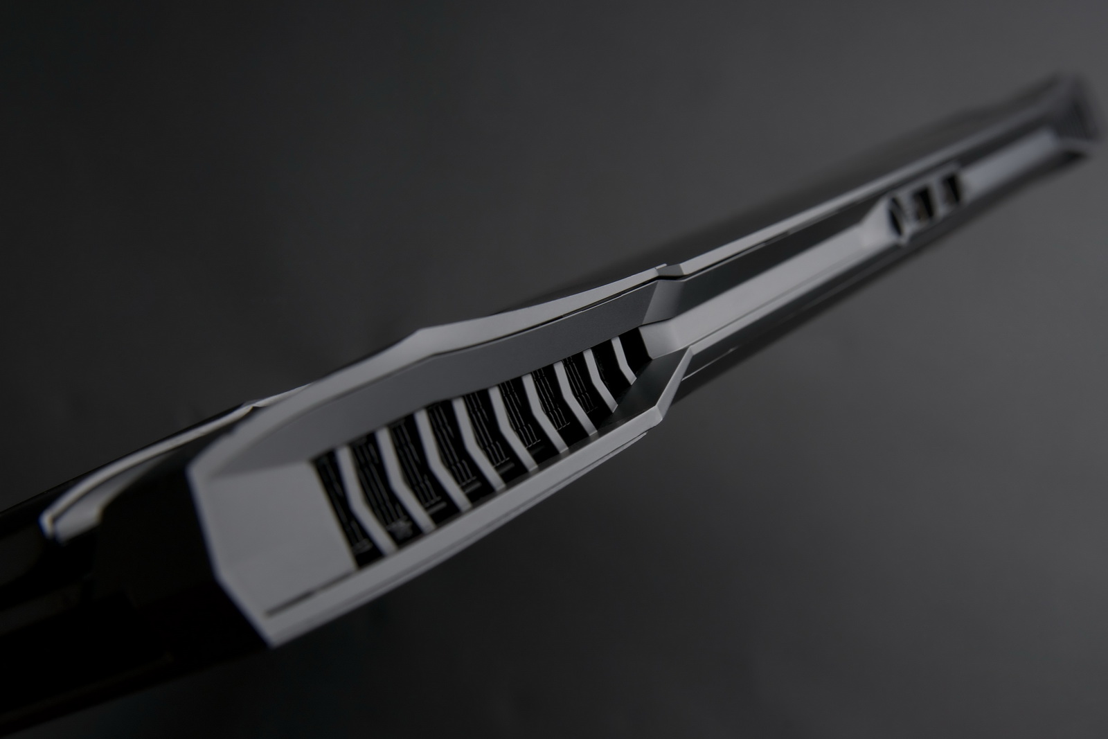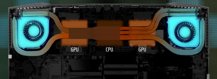 Trotz der geringen Bauhöhe schafft es Aorus, in das schicke Blade-Type-Notebook X7 neben einem Intel Core i7-4700HQ Quadcore-Prozessor und bis zu 32 GByte Hauptspeicher auch gleich noch 2 (!) GeForce GTX 765M (SLI-Verbund) mit 4 GByte GDDR5-Videospeicher unterzubringen - und zu kühlen. 2 Lüfter pusten die heiße Luft der Hochleistungskomponenten via 4 Lüfteröffnungen (5 Heatpipes) ins Freie.