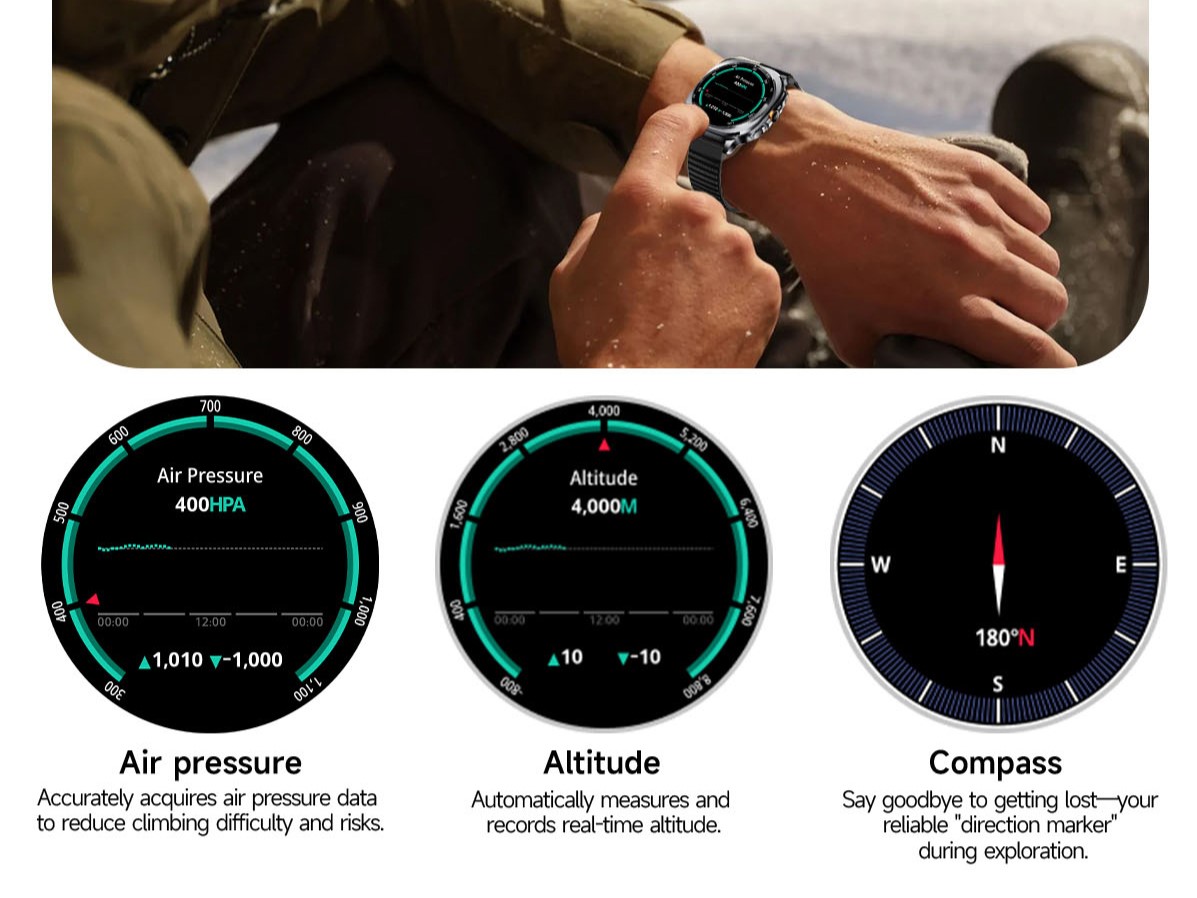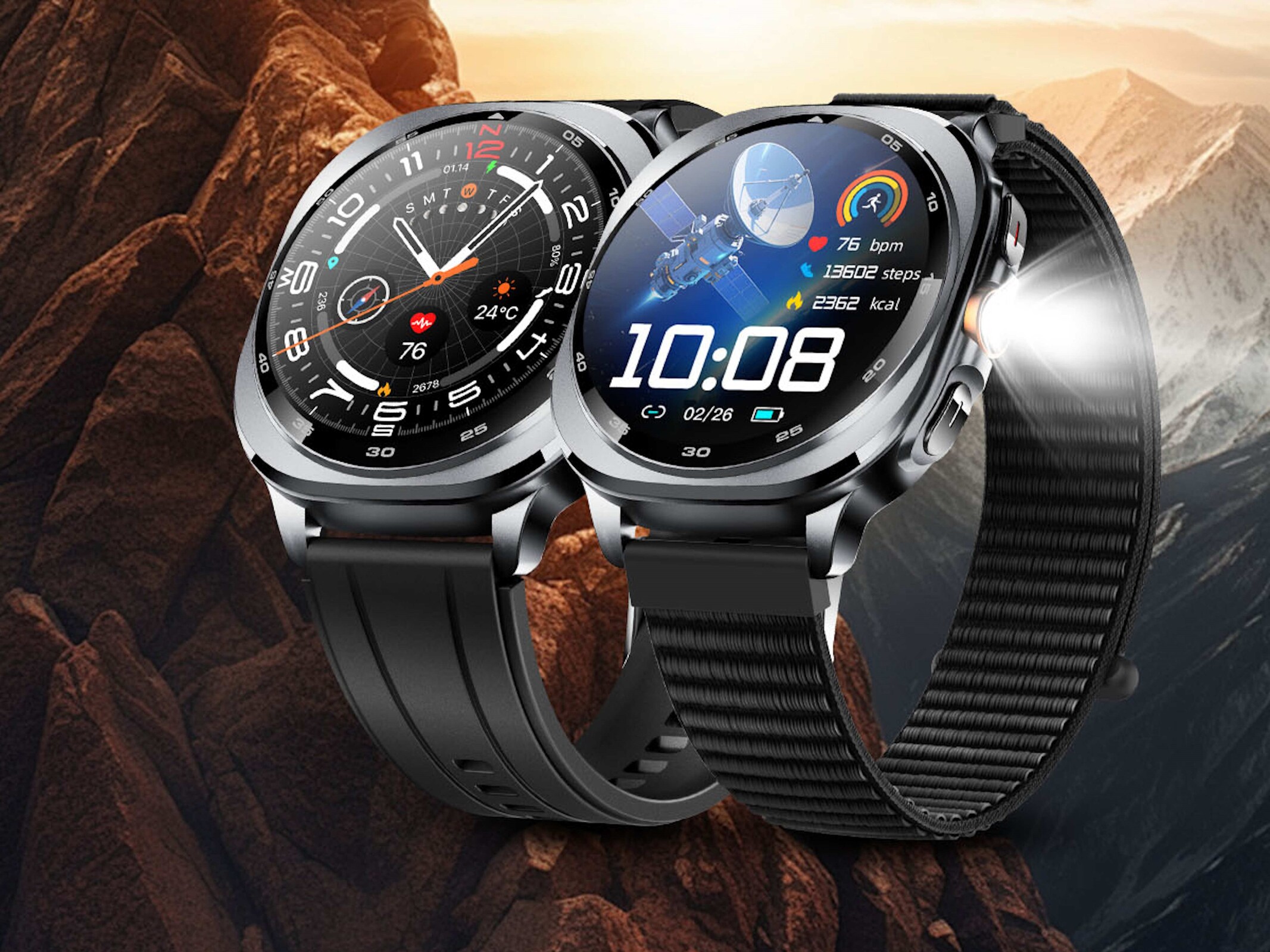 Nicht selbstverständlich ist das Vorhandensein einer Taschenlampe an der Seite, das könnte etwa beim Campen oder Outdoor-Aktivitäten sinnvoll sein. Verbaut ist auch ein GNSS-Modul, womit sich die eigene Position erfassen lässt. Damit kann die Distanz einer Laufrunde gemessen werden, was dann über die Geschwindigkeit und in Kombination mit der erfassten Herzfrequenz durchaus Rückschlüsse auf den Leistungszustand zulässt. Die Messung der Sauerstoffsättigung des Bluts ist ebenfalls möglich. Zum Funktionsumfang zählt wie üblich auch die Analyse der Schlafqualität und der Schlafdauer. Nutzbar sind verschiedene Ziffernblättern, damit lässt sich die Anzeige der Uhr an die eigenen Bedürfnisse anpassen.