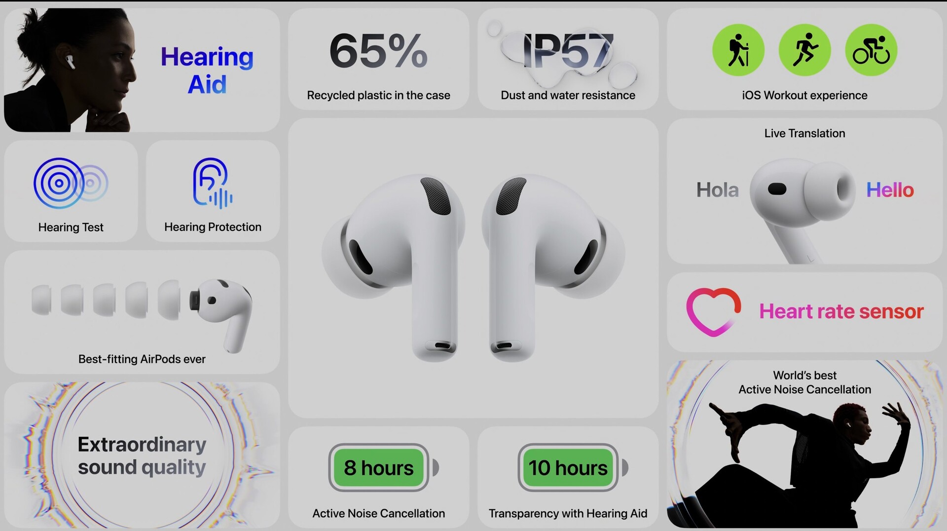 Wer die Hörgerätefunktion nutzt, darf sich über 67 Prozent längere Akkulaufzeiten freuen, generell verspricht Apple 2 Stunden längere Laufzeiten mit aktiviertem ANC pro Ladung als bei den Vorgängern und 4 Stunden mehr im Transparenzmodus. Das sind aber nur inkrementelle Änderungen, die großen Neuigkeiten sind eine integrierte Herzfrequenzmessung sowie die Übersetzung von Gesprächen in Echtzeit. Letzteres ist vorerst als Beta verfügbar und soll natürliche Gespräche mit Personen anderer Herkunft ermöglichen, entweder mit schriftlicher und mündlicher Übersetzung des Gesprochenen am iPhone oder mit direkter Übersetzung falls auch der Gesprächspartner AirPods Pro 3 trägt.