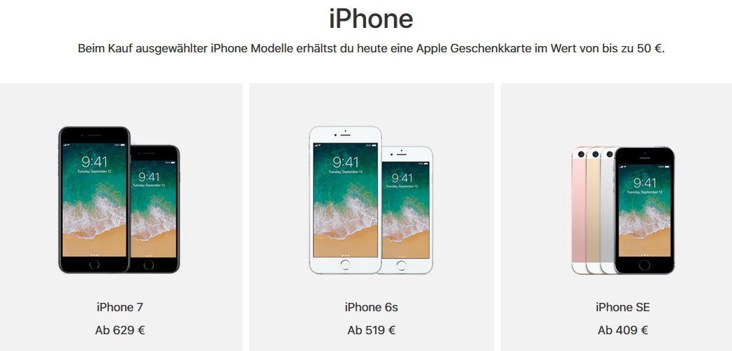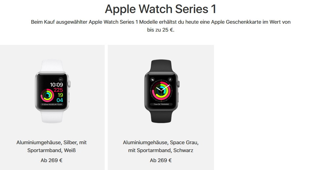 Bis zu 50 Euro als Geschenkkarte gibt es von Apple heute für den Kauf von iPhone SE, iPhone 6s und iPhone 7. Bei den Wearables hat Apple einen Deal für die Apple Watch Series 1 vorbereitet. Wer die Apple Watch Series 1 in Silber mit weißem Sportarmband oder das Modell in Space Grau und schwarzem Armband kauft, erhält eine 25-Euro-Geschenkkarte von Apple dazu.
