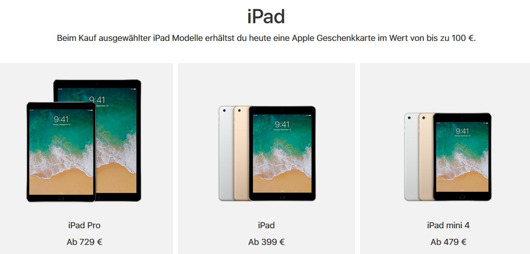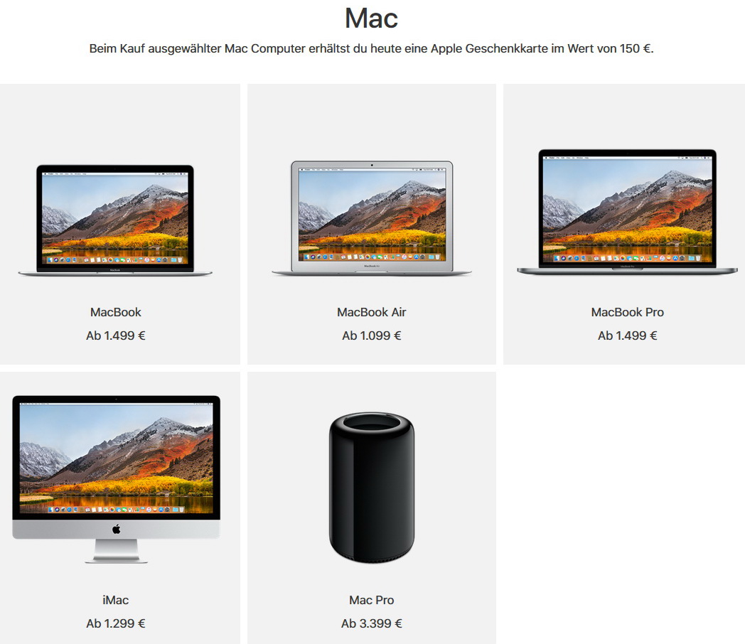 Auf der speziell für diesen Deal eingerichteten Webseite von Apple bietet das Unternehmen aus Cupertino im Rahmen des eintägigen Shopping-Events beispielsweise beim Kauf von MacBook, MacBook Air, MacBook Pro, iMac und Mac Pro eine Geschenkkarte im Wert von 150 Euro. Käufer der Tablets iPad, iPad mini 4 oder iPad Pro erhalten bis zu 100 Euro in Form einer Geschenkkarte.