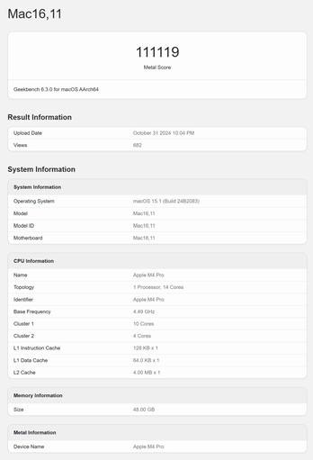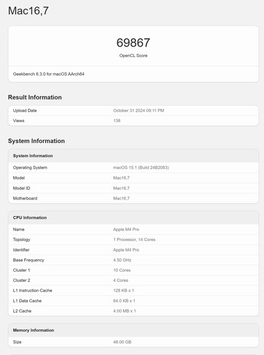 Selbst verglichen mit dem 16-Kerner Apple M3 Max mit 21.253 Punkten aus dem Vorjahr muss sich der Apple M4 Pro nicht verstecken. Mittlerweile findet man auf Geekbench auch einige weitere Testergebnisse zum neuen Apple-Chip, die auch für Grafik-Interessierte gute Nachrichten verkünden. So deutet ein OpenCL-Score von 69.867 Punkten auf eine etwa 38 Prozent höhere GPU-Performance im Vergleich zum Apple M3 Pro mit 50.373 Punkten, wobei hier der Apple M3 Max mit seiner 40-Core-GPU und über 91.000 Punkten noch die Oberhand behält. Auch der Metal-Score von 111.119 Punkten deutet auf über 41 Prozent mehr Power als bei unserem Metal-Ergebnis von 78.324 Punkten des 18-Core Apple M3 Pro.