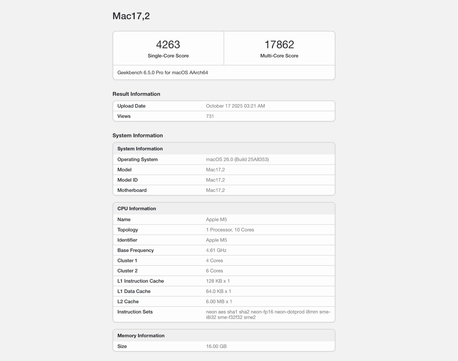 | Apple M5 (10 Kerne) | 4.263 | 17.862 |