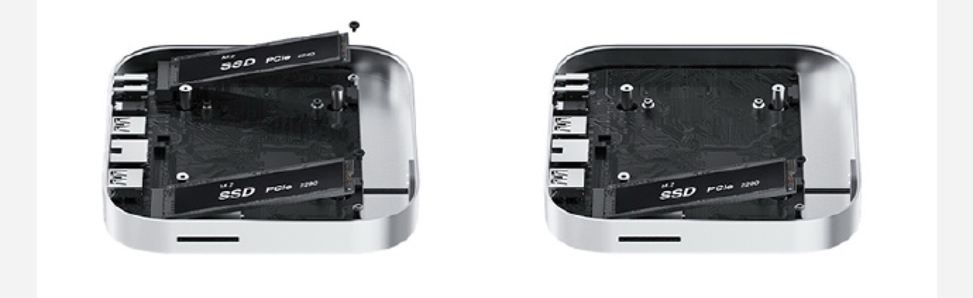 Die Docking-Station wird in zwei Varianten angeboten. Eine Version besitzt einen M.2-2280-Slot, der eine SSD per PCIe 5.0 x4 anbindet, wodurch diese Datenraten bis 5.809 MB/s erzielen soll. Die zweite Version besitzt zwei M.2-Slots, und soll den Speicher des Mac mini dadurch um bis zu 16 TB erweitern können, allerdings wird jede SSD nur per PCIe 5.0 x2 angebunden, wodurch die maximal mögliche Geschwindigkeit effektiv halbiert wird.