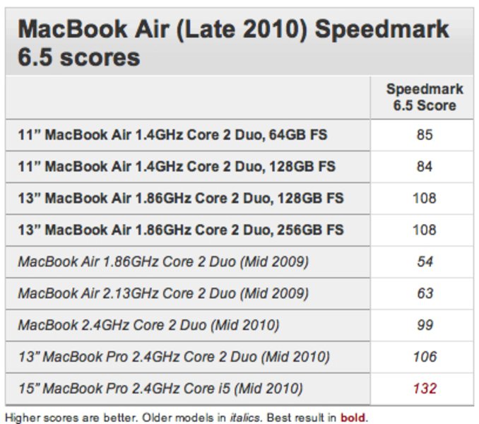 Die Kollegen der amerikanischen Macworld liefern erfreulicherweise die ersten Benchmarks der neuen Apple MacBook Air (MBA). Dabei werden vier Modelle unter die Lupe genommen: MacBook Air 11 Zoll mit 1,4 GHz Intel Core 2 Duo und 64 beziehungsweise 128 GByte SSD sowie das größere 13 Zoll MacBook Air mit 1,86 GHz Intel Core 2 Duo und 128 beziehungsweise 256 GByte SSD. Um eine Vergleichsbasis zu erhalten wird der Speedmark-Benchmark verwendet.