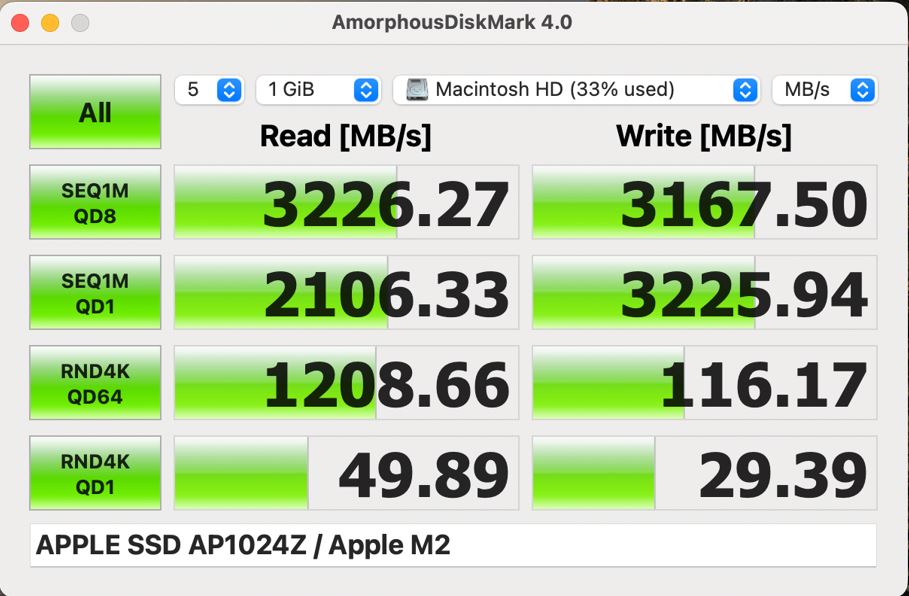 | Apple MacBook Air M2 10C GPU M2 10-Core GPU, M2, Apple SSD AP1024Z | Apple MacBook Air M2 Entry M2 8-Core GPU, M2, Apple SSD AP0256Z | Apple MacBook Pro 13 2022 M2 M2 10-Core GPU, M2, Apple SSD AP1024Z | Apple MacBook Pro 14 2021 M1 Pro Entry M1 Pro 14-Core GPU, M1 Pro 8-Core, Apple SSD AP0512 | Asus Zenbook S 13 OLED Radeon 680M, R7 6800U, Samsung PM9A1 MZVL21T0HCLR | Dell XPS 13 Plus 9320 4K Iris Xe G7 96EUs, i7-1260P, Samsung PM9A1 MZVL21T0HCLR | |