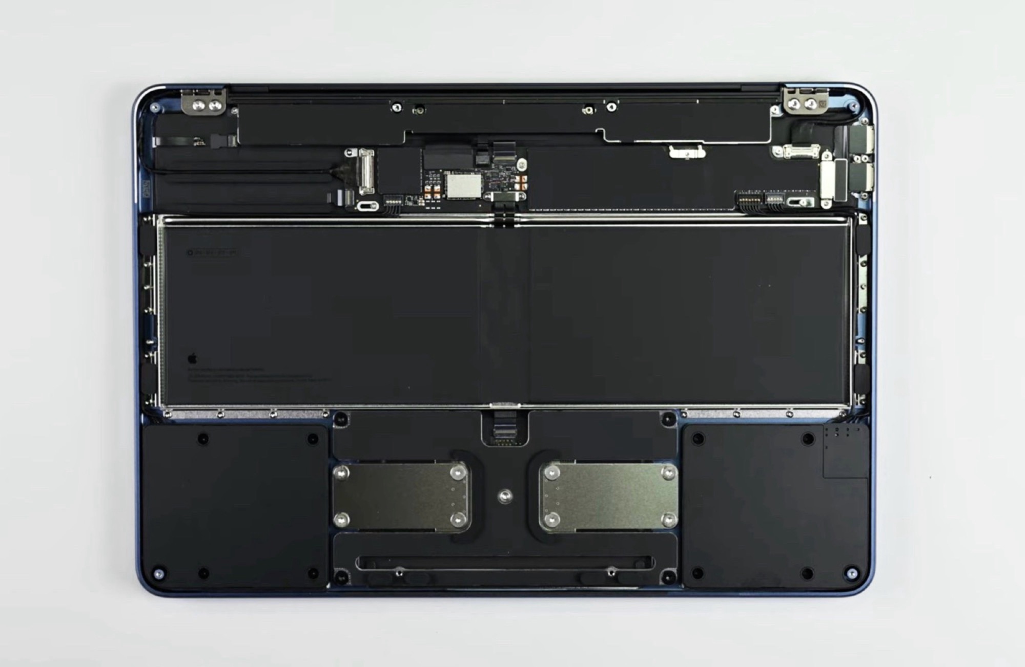 Trotz fast identischer Hardware ist das Mainboard deutlich größer als beim iPhone 16 Pro, aber weniger als halb so groß wie das Mainboard eines MacBook Air. Die beiden USB-C-Anschlüsse und der 3,5 mm Kopfhöreranschluss können genau wie das Trackpad modular getauscht werden. Überraschend ist, dass selbst das Mainboard und der Touch ID Fingerabdrucksensor von einem MacBook Neo in ein anderes verpflanzt werden können – Apple verzichtet anders als bei vielen älteren MacBooks darauf, diese Komponenten durch die Seriennummer an ein Gerät zu binden.