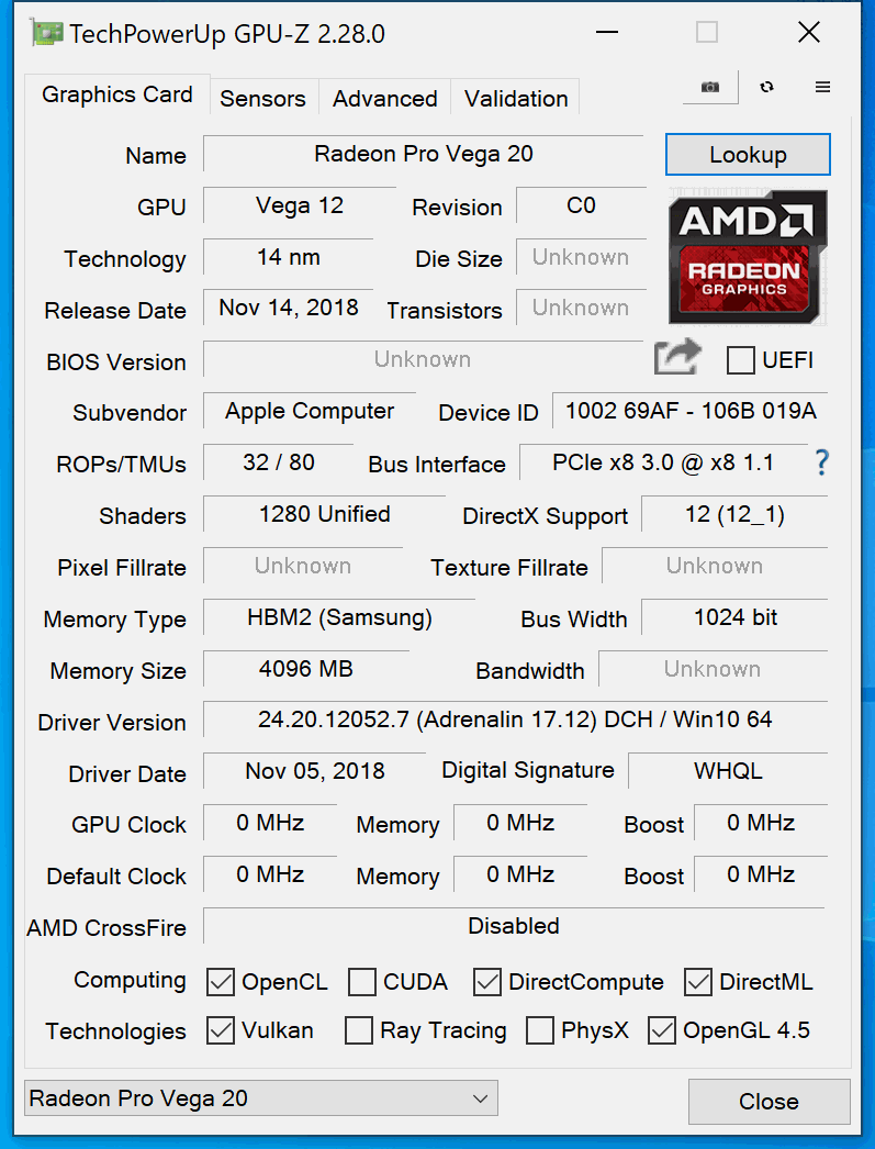 Die Grafikkarte AMD Radeon Pro Vega 20 kennen wir bereits aus dem Test des 2018er MacBook Pro 15, damals noch in Verbindung mit dem 6-Kern Core-i9-Prozessor von Intel. Genau wie die kleinere Vega 16 setzte die Vega 20 im Vergleich zu den anderen Radeon-Pro-GPUs (GCN4-Architektur) auf die neuere GCN5-Architektur, mit der vor allem die Effizienz verbessert wird. Das haben wir schon im damaligen Testbericht ausführlich gezeigt.