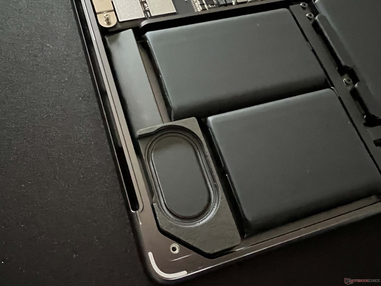 Die untere Abdeckung ist mit Pentalobe-Schrauben (P5) und kleinen Metallhaken am Heck gesichert, nach dem Lösen der Schrauben muss die Abdeckung also erst etwas nach vorne gezogen werden, bevor man sie dann abheben kann. In der Mitte gibt es zudem noch zwei Klammern, hier muss man etwas Kraft aufwenden (idealerweise mit einem Saugnapf). Im Inneren gibt es aber ohnehin nicht viel zu tun, lediglich die Lüfter können durch den Endnutzer gereinigt werden. Alle anderen Komponenten sind verlötet und es gibt weiterhin keine Aufrüstmöglichkeiten.