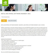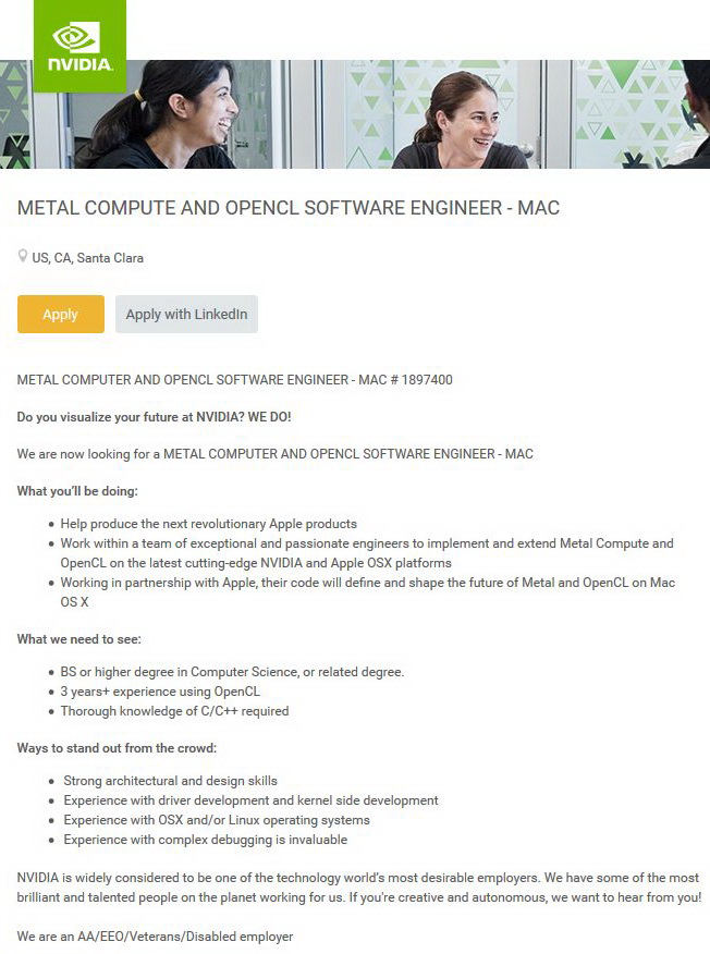 Konkret sucht Nvidia für das Nvidia Mac Grafiktreiber-Team einen Senior System Software Engineer, einen Metal und OpenGL Software Engineer und einen Metal Compute und OpenCL Software Engineer. In den Stellenanzeigen spricht Nvidia unter anderem davon: