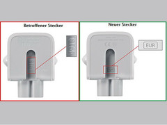 Rückruf: Apple tauscht gefährliche Netzteilstecker-Adapter aus, bei denen die Steckkontakte brechen können und die Gefahr eines Stromschlags droht. Das freiwillige Rückrufprogramm von Apple gilt für Netzteilstecker-Adapter, die für den Gebrauch in Argentinien, Australien, Brasilien, Kontinentaleuropa, Neuseeland und Südkorea entwickelt wurden.