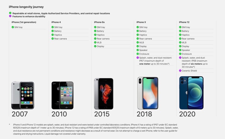 Die Umweltbilanz soll weiter verbessert werden, indem Produkte immer langlebiger und reparierbarer werden. Gerade letztere Aussage passt nicht so recht zum Image des Unternehmens, denn Apple ist kein Freund davon, Kunden die Reparatur ihrer Geräte zu erlauben. In der unten eingebetteten Grafik spricht der Konzern aber davon, dass die eigenen Service Center beim iPhone 12 mehr Reparaturen als je zuvor durchführen können, während das Ceramic Shield und das wasserfeste Gehäuse die Notwendigkeit für Reparaturen reduzieren soll.
