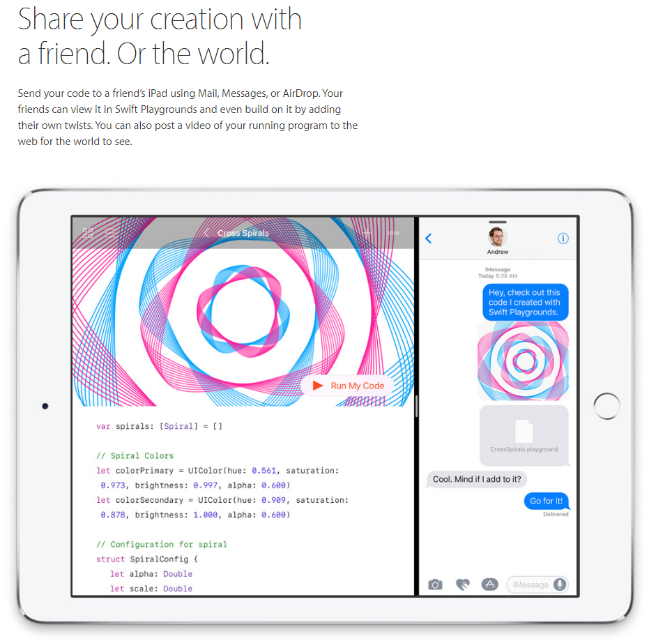 Der Code kann in Xcode, der professionellen Entwicklungsumgebung von Apple exportiert und dort weiterbearbeitet werden, auch das Teilen mit Freunden und gemeinsame Arbeiten am Code ist möglich. Das Endresultat kann als Fullscreen-Video bewundert und geteilt werden. Swift Playgrounds wird im Herbst, zusammen mit iOS 10 kostenlos für alle zur Verfügung stehen.