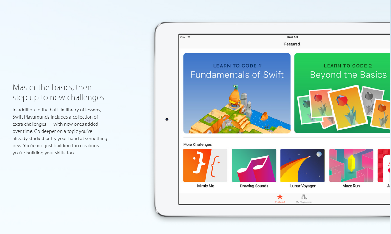 Apple hat die Programmiersprache Swift Ende 2015 als Open-Source-Projekt freigegeben und wollte damit die Verbreitung fördern. Zukünftig soll sie Objective C ersetzen, die aktuelle Standard-Sprache im Apple-Universum. Mit der kostenlos erhältlichen iPad-App "Swift Playgrounds" sollen Einsteiger gelockt werden, Programmieren zu Lernen und zwar gleich mit der "richtigen Sprache". Apple sieht inbesondere Kinder als Zielgruppe für seine neue Lern-Initiative.