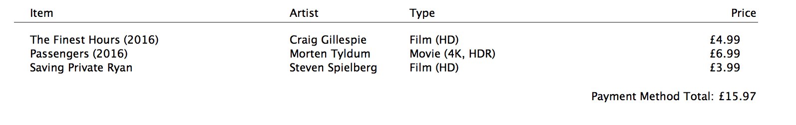 Im Februar hörten wir das letzte Mal, dass Apple endlich an 4K-Unterstützung für die nächste Apple TV-Generation arbeitet, was nicht weiter verwundert, ist die Konkurrenz doch bereits vor Monaten vorgeprescht und hat 4K- und HDR-fähige Streamingplayer auf den Markt geworfen. Nun sind erneut Indizien aufgetaucht, die darauf hindeuten, dass hinter den Kulissen eifrig an einer Erweiterung jenseits von Full-HD-Auflösung gearbeitet wird. Im MacRumors-Forum hat ein iTunes-Kunde einen Screenshot seiner Filmabrechnung hochgeladen (siehe Bild unten), die beim Film Passengers aus 2016 die Tags HDR und 4K ausweist.