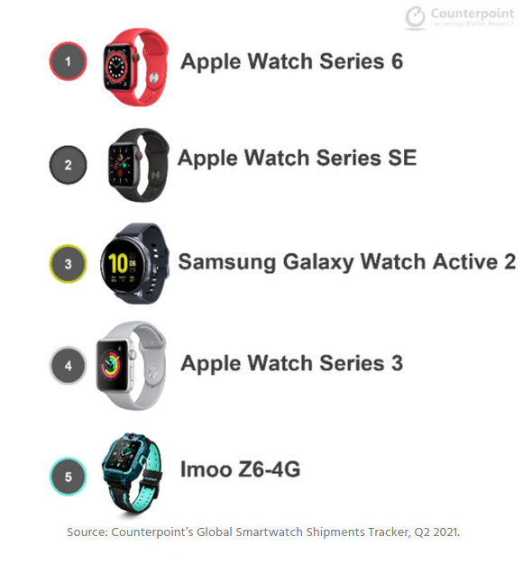 Die weltweiten Lieferzahlen für Smartwatches haben sich im zweiten Quartal 2021 im Vergleich zum Vorjahreszeitraum um 27 Prozent und damit deutlich erhöht. Wie aus dem kürzlich veröffentlichten Global-Smartwatch-Model-Tracker der Analysten von Counterpoint Research zu entnehmen ist, behauptete Apple mit der Apple Watch seine Position als Nummer 1 bei den Smartwatches mit soliden Absatzzahlen. Allerdings büßt die Apple Watch im Vergleich zum Vorjahreszeitraum ein paar Prozentpunkte Marktanteil ein, da der Wettbewerb durch chinesische und indische Smartwatch-Marken härter wird.