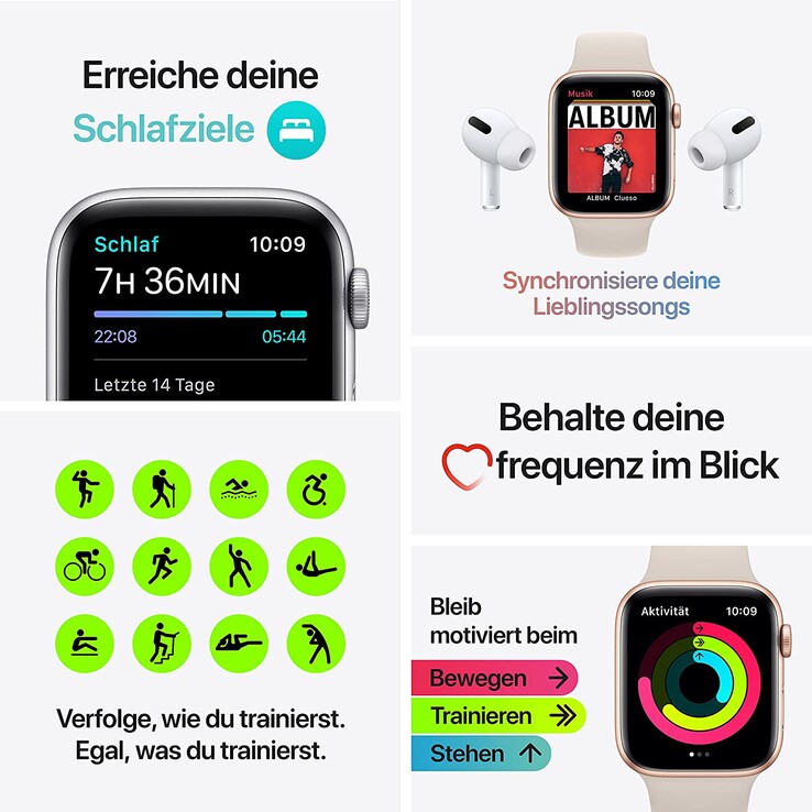 Für knapp 300 Euro gibt es die 44 mm große Apple Watch SE (2021) mit GPS in den gleichen Ausführungen, also jeweils mit Sportarmband und der Farbkombination Space Grau / Mitternacht, Gold / Sternenlicht und Silber / Abyssblau.