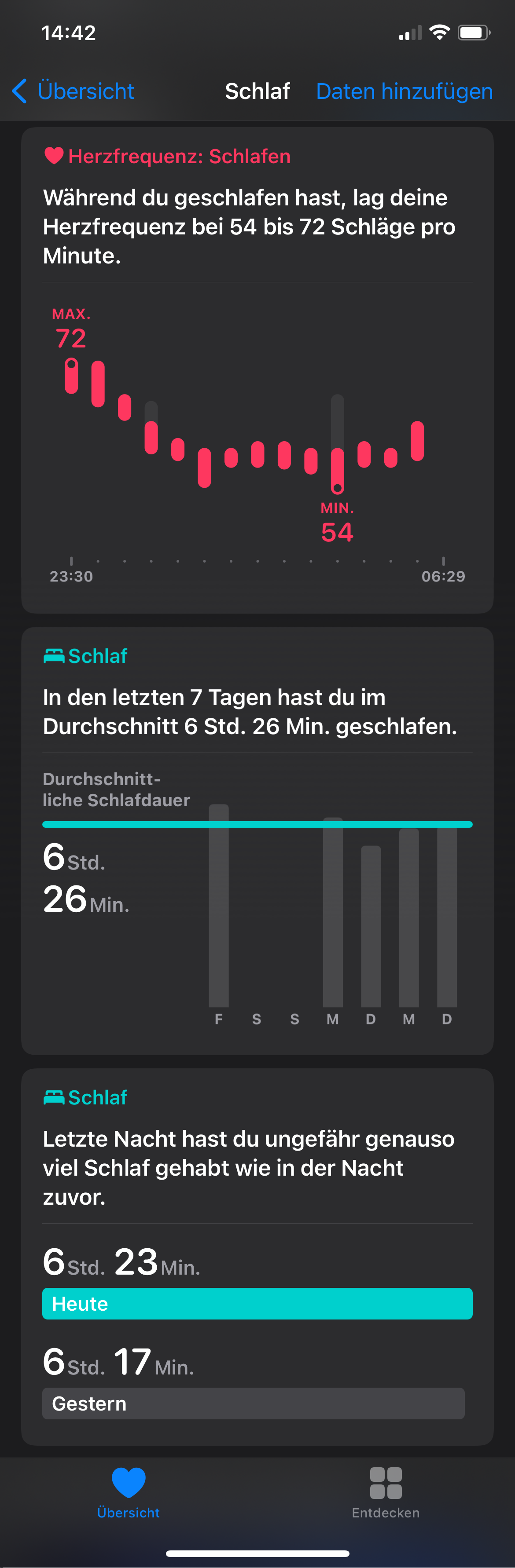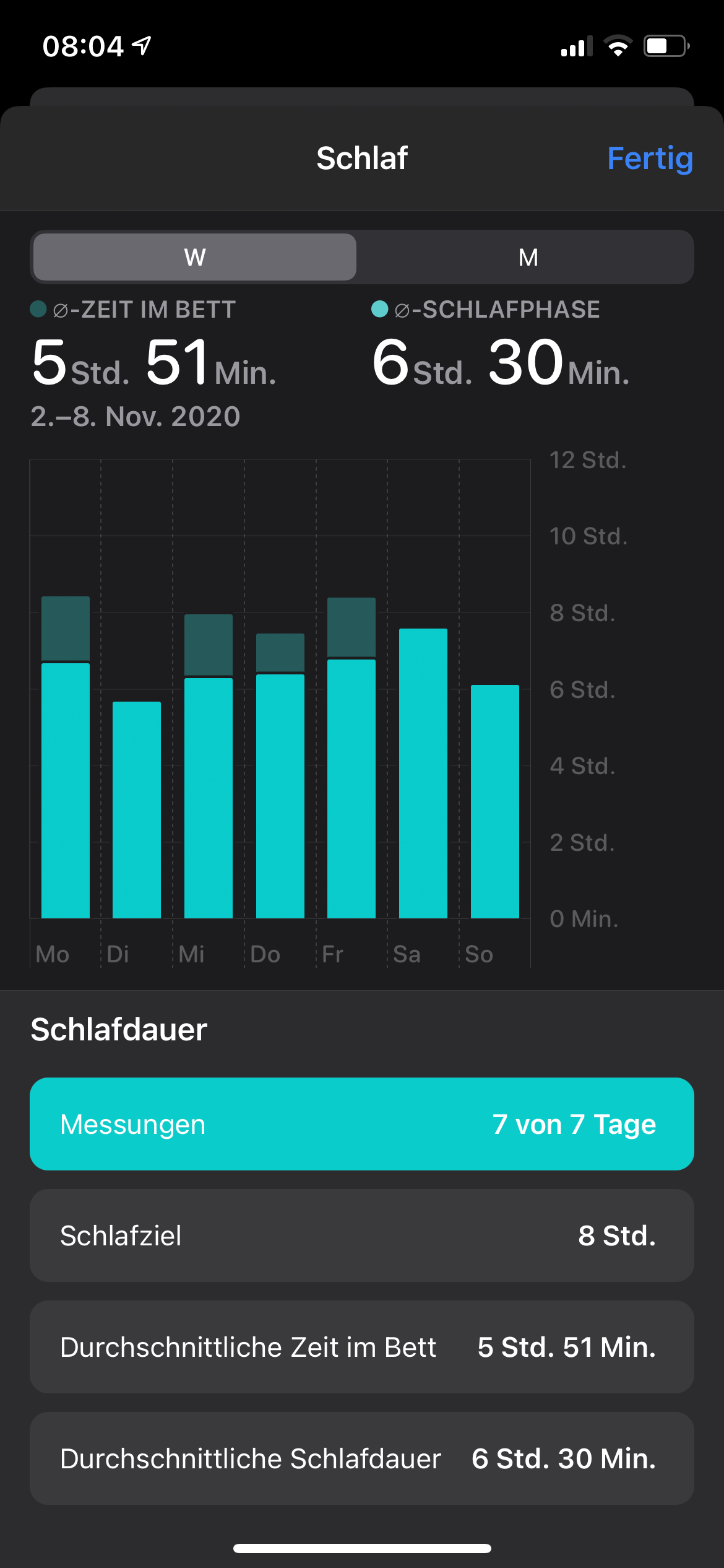 Die Watch erfasst die Einschlaf- und Aufwachzeit sowie Unterbrechungen. Übersichtsdiagramme vergleichen den Verlauf der letzten Tage und Wochen und stellen dar, ob man das für die Werktage und Wochenenden gesteckte Schlafziel erreicht hat. Herzfrequenz und Sauerstoffsättigung liefert die Health App zwar, kombiniert sie aber nicht zu einem gemeinsamen Schlafdiagramm. Zudem dürften die unregelmäßigen Messungen, anders als bei Fitbit, kaum Hinweise auf eine Schlafapnoe geben können.