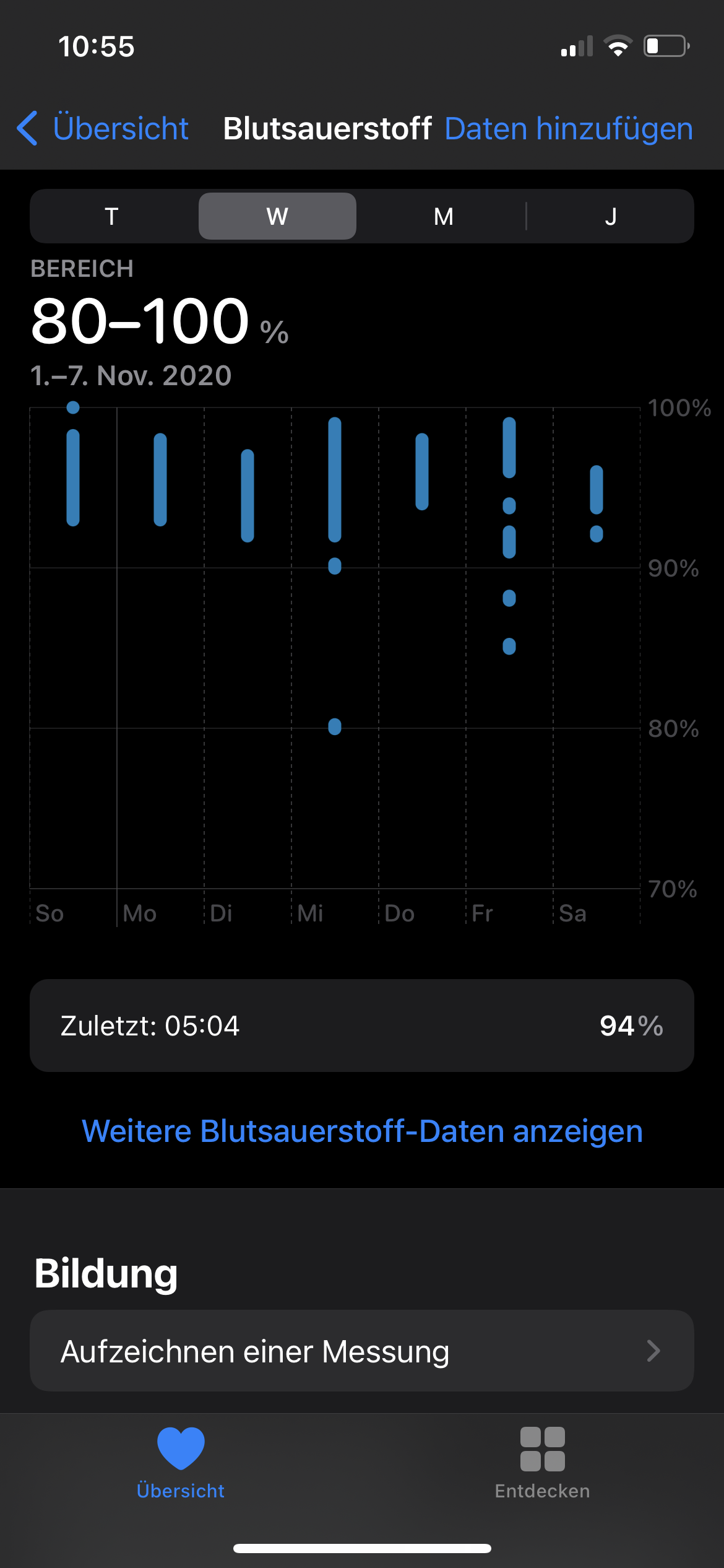 Häufigere Messungen scheitern vermutlich immer noch am Laufzeitproblem der Apple Watch. 30 Prozent Restkapazität kalkuliert Apple aktuell für die nächtliche Aufzeichnung; ist diese aktiviert und der Akku bereits vor der anvisierten Zubettgehzeit unter 30 Prozent, gibt sie eine Warnung aus. Wo die Apple Watch 6 mehr Schlafzeiten hernimmt als im Bett verbrachte Zeiten (letzter Screen), ist unklar. Power-Naps gab es im Testzeitraum leider keine.