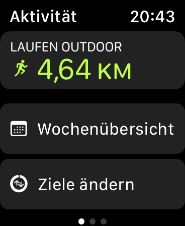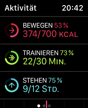 Darüber hinaus motiviert und unterstützt die App »Aktivität« Apple Watch-Nutzer, weniger zu sitzen und sich mehr zu bewegen. Im Fokus steht die tägliche Erreichung von Steh-, Bewegungs- und Trainingszielen. Das Stehziel richtet sich gegen langanhaltendes Sitzen. Erhebt man sich regelmäßig von seinem Stuhl und läuft etwa eine Minute lang umher, rückt man auch dem Bewegungsziel automatisch näher, wie auch mit jedem Brief, den man zu Fuß zum Briefkasten bringt anstatt mit dem Auto.