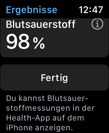 Bei der Messung der Blutsauerstoffsättigung lag die Abweichung gegenüber einem zertifizierten Pulsoxymeter bei niedrigen 1,5 Prozentpunkten, die maximale Abweichung lag bei 3 Prozentpunkten. Über die App »Blutsauerstoffsättigung« auf der Watch kann man die Sättigung manuell messen. Auf Wunsch misst sie sie mehrmals täglich und während des Schlafens automatisch. Die Health-App auf dem iPhone zeichnet dazu ein Diagramm über den Tages-, Wochen- oder Monatsverlauf.